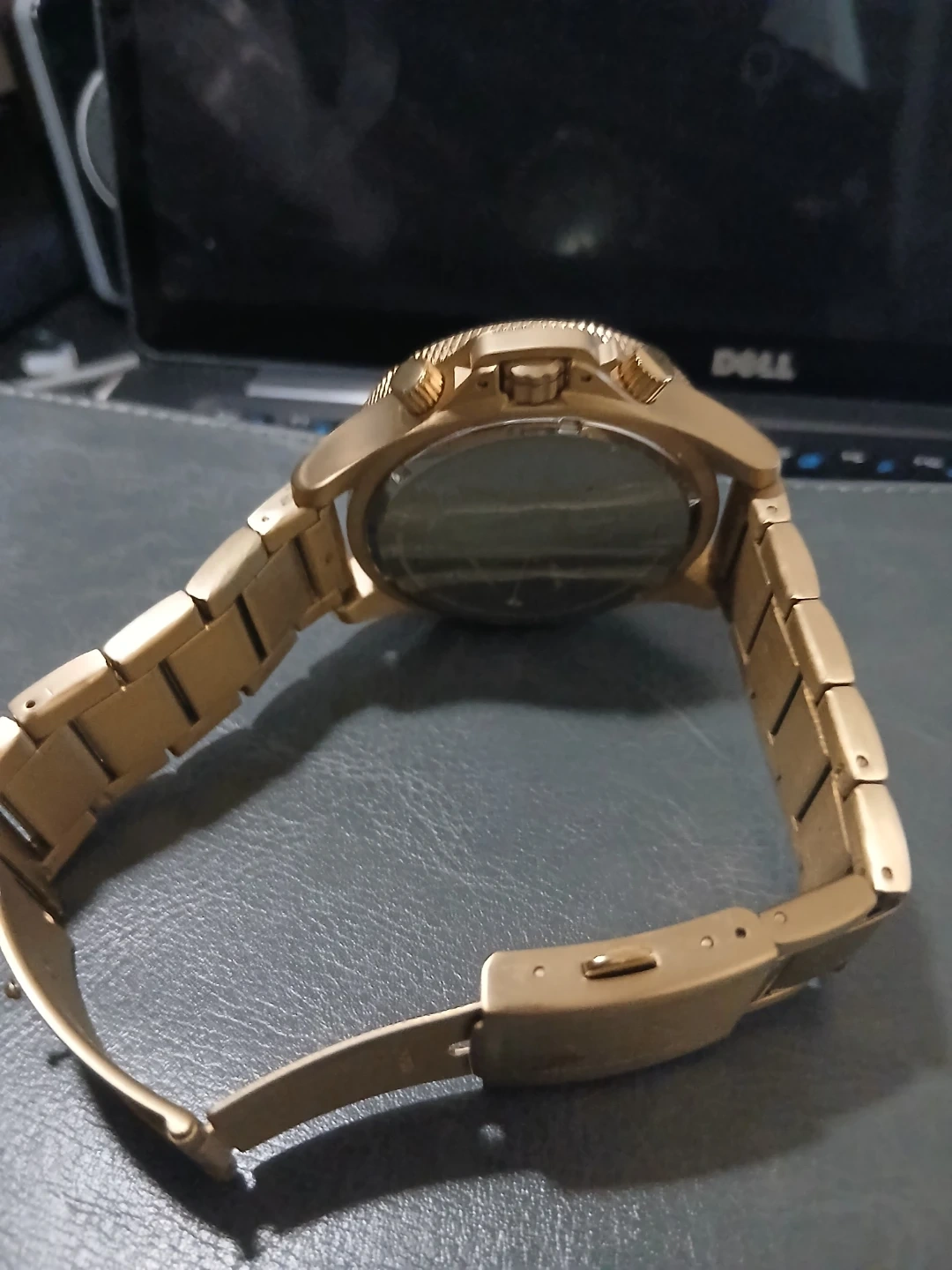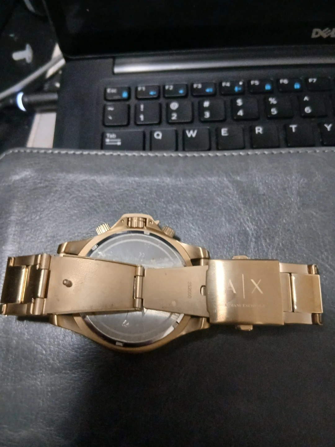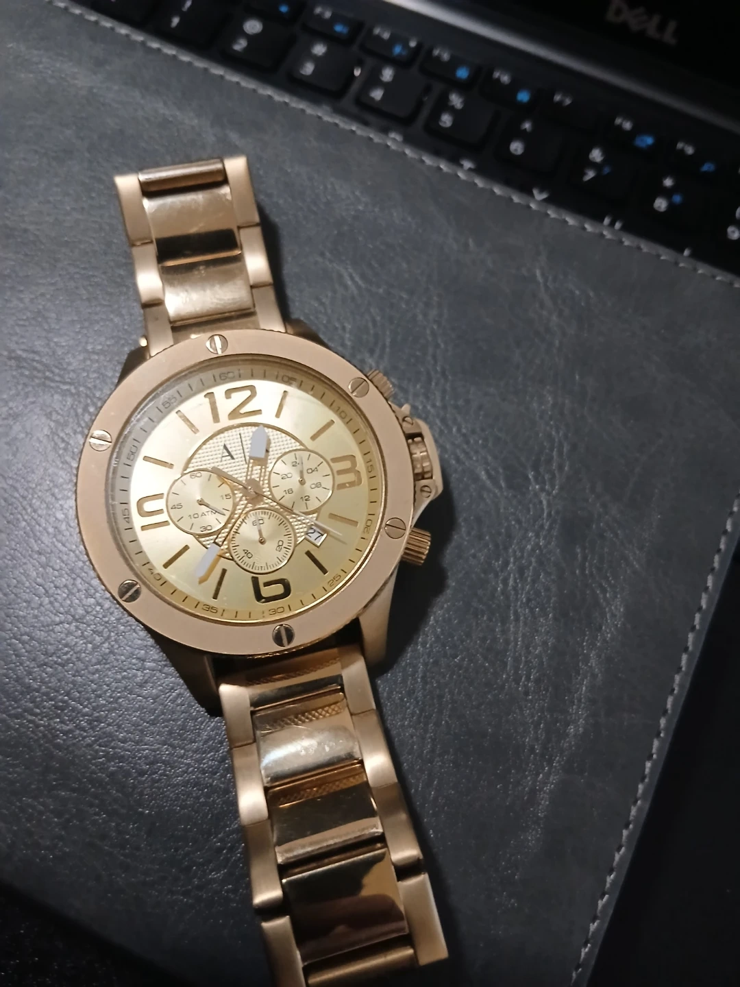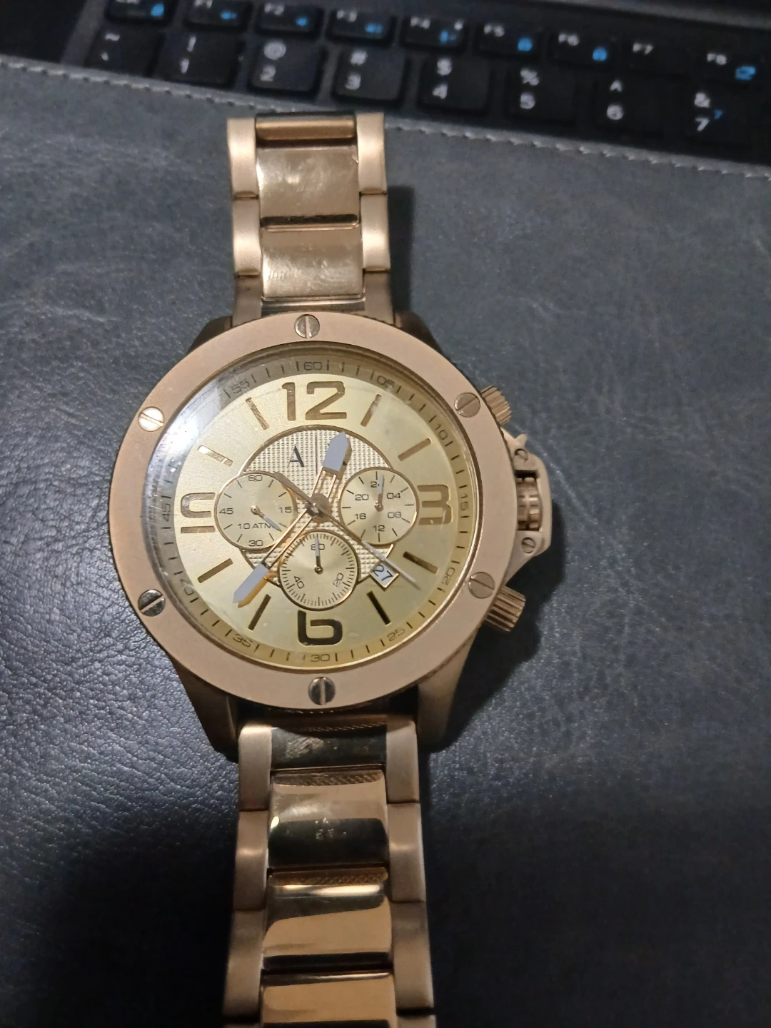 Selling a gold-tone Armani Exchange watch. It's in good condition and has a stylish design. The watch features a chronograph dial and a stainless steel band. A great addition to any outfit!