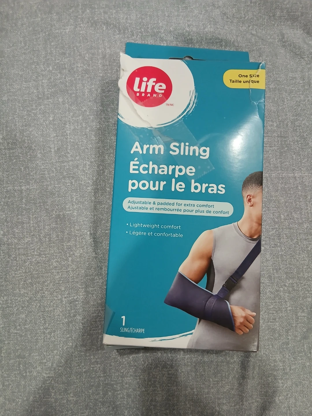 Selling a Life Brand arm sling, one size fits all. It comes in its original box and features an adjustable and padded design for extra comfort. It's lightweight and made of washable polyester fabric. Great for anyone needing support for their arm!