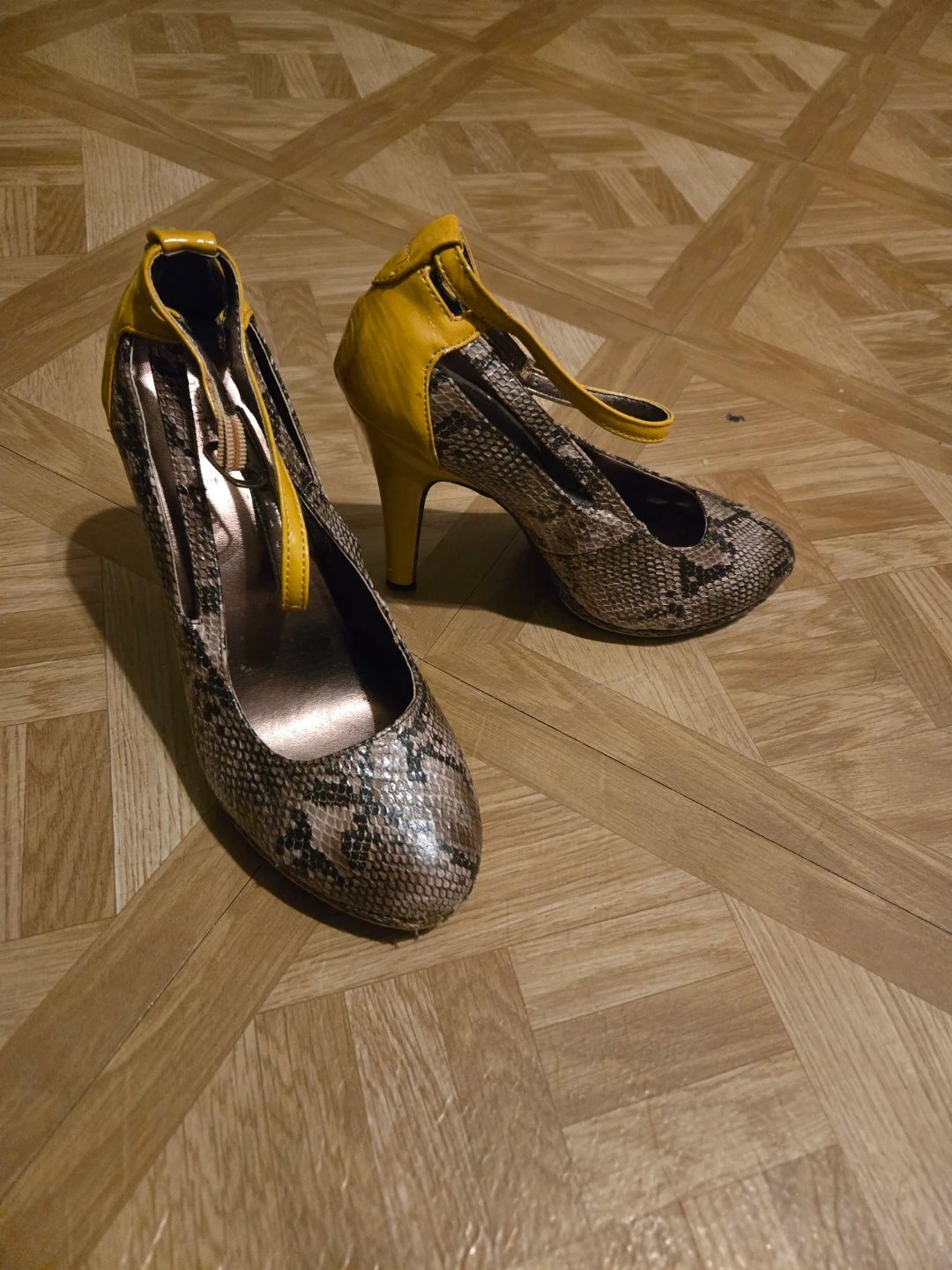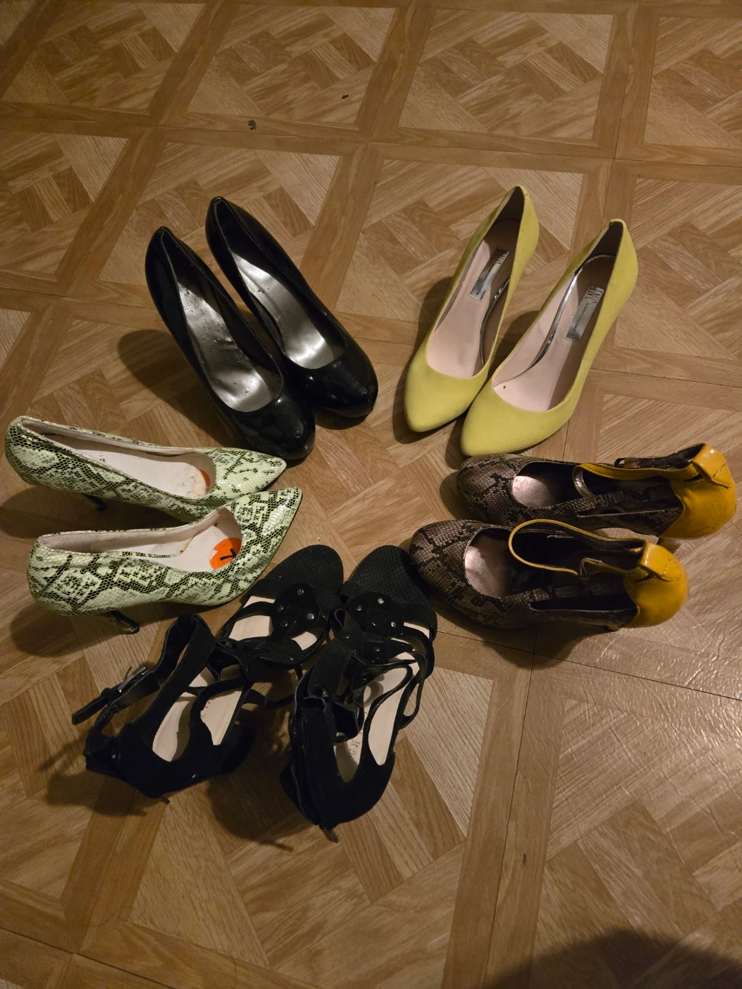 Selling a variety of heels. There are INC International Concepts yellow heels, black heels, snake print heels, and black heels with straps. All are in good condition!