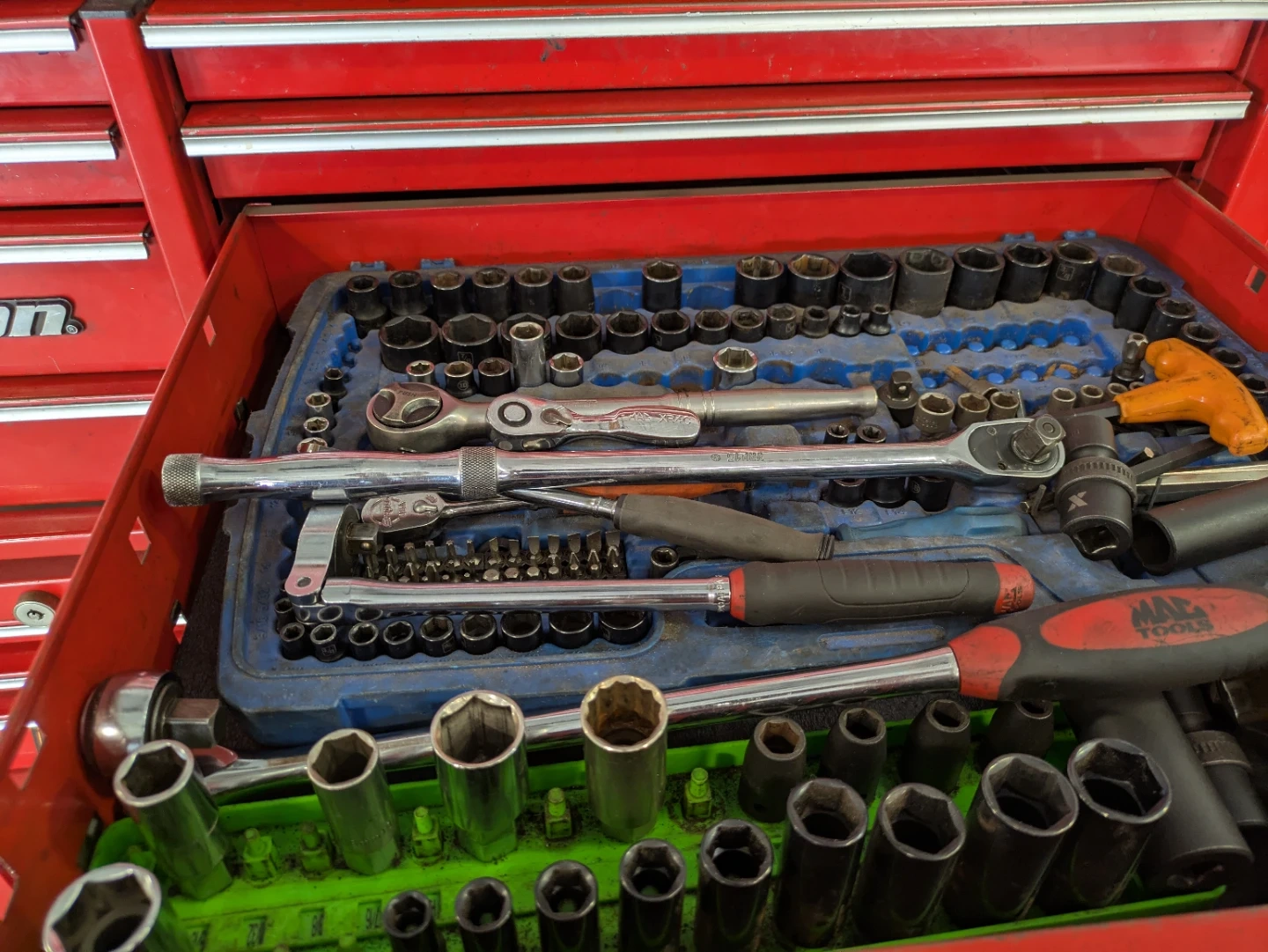 Selling a red Snap-on tool chest. It's in used condition and has lots of space for all your tools. It includes various tools inside the drawers.