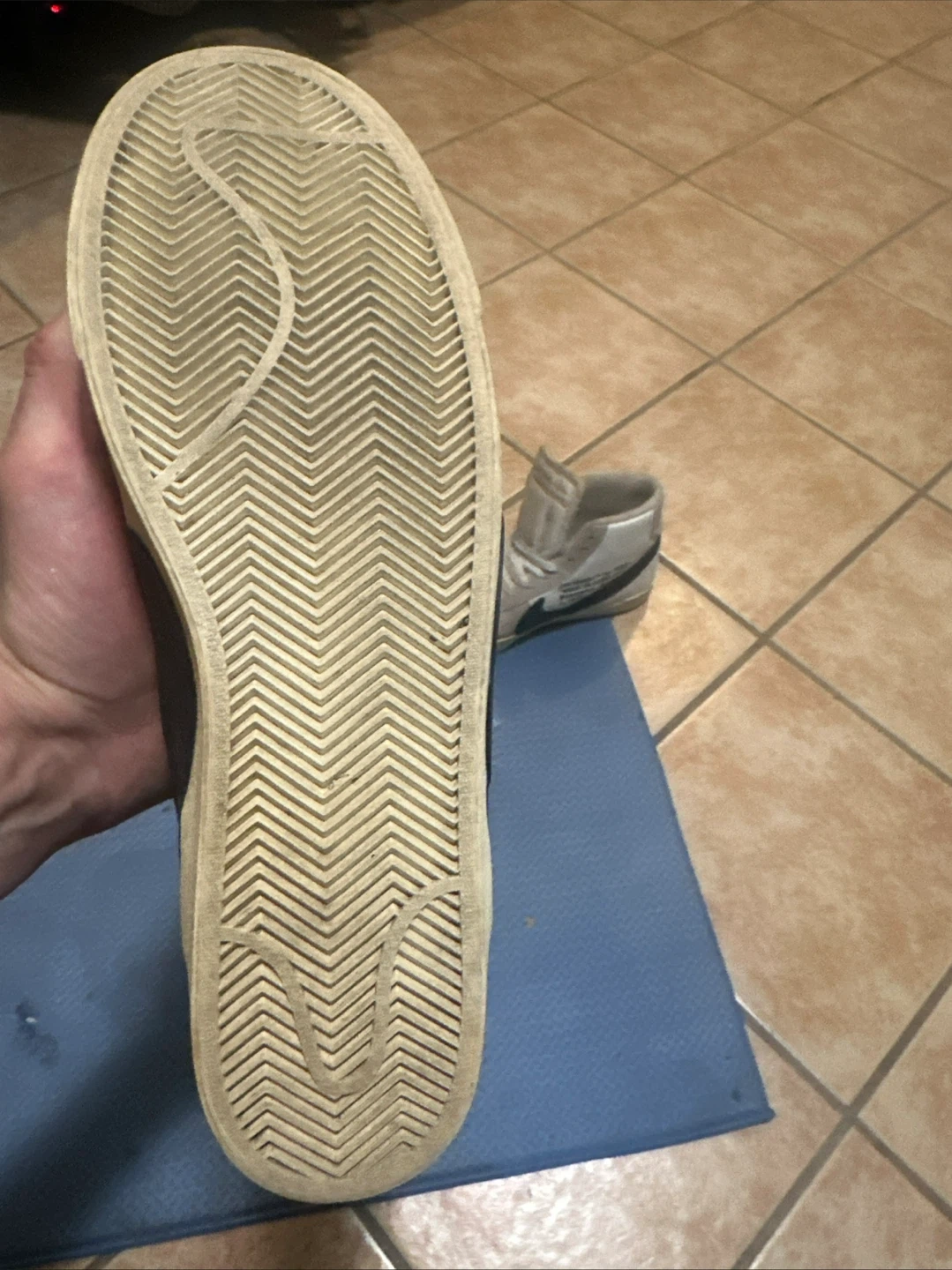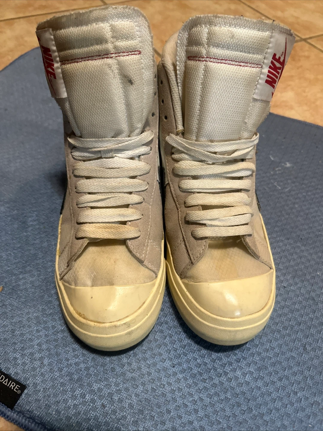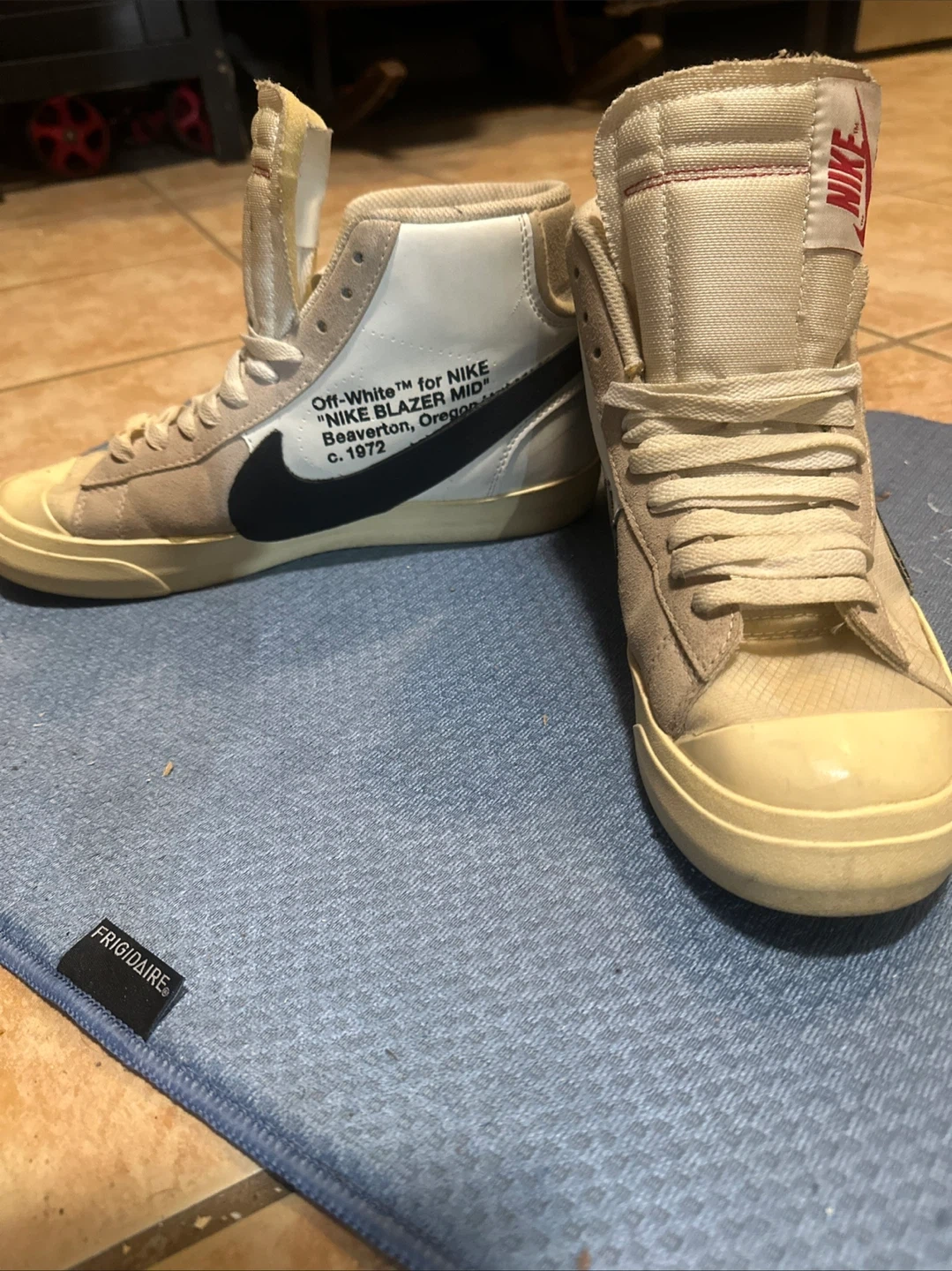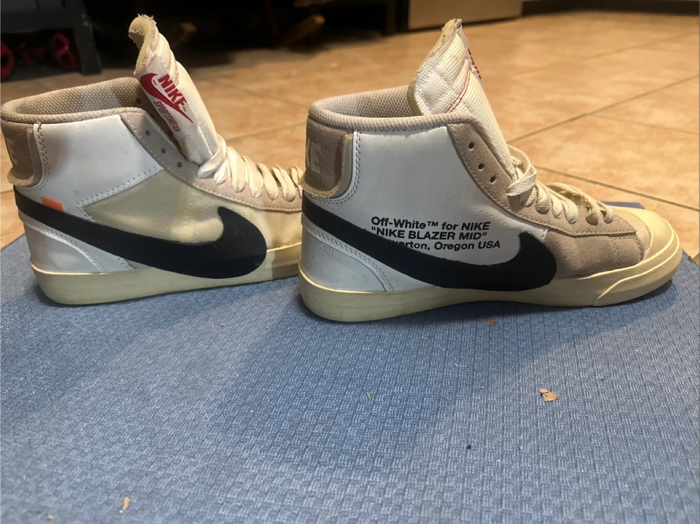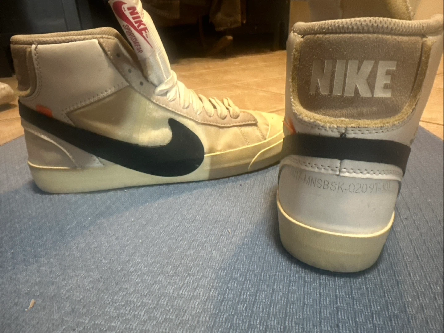 Selling a pair of Nike Blazer Mid Off-White sneakers. They feature the iconic Off-White design with the signature text on the side. Great for sneaker enthusiasts!