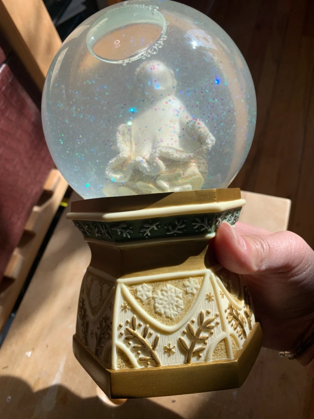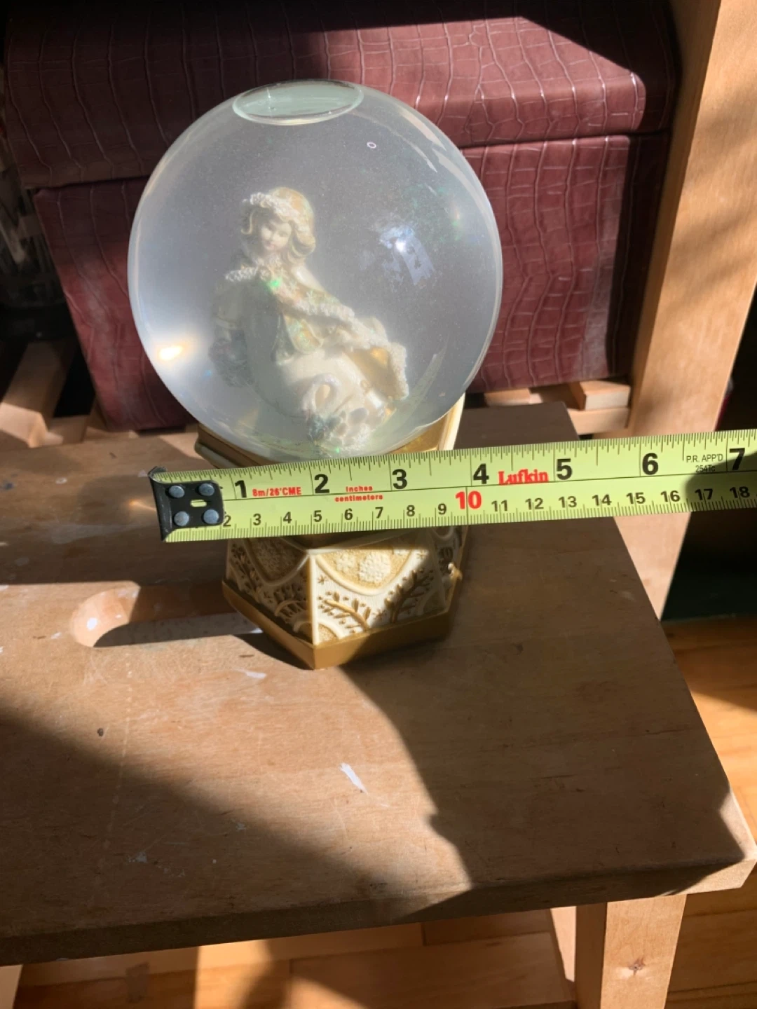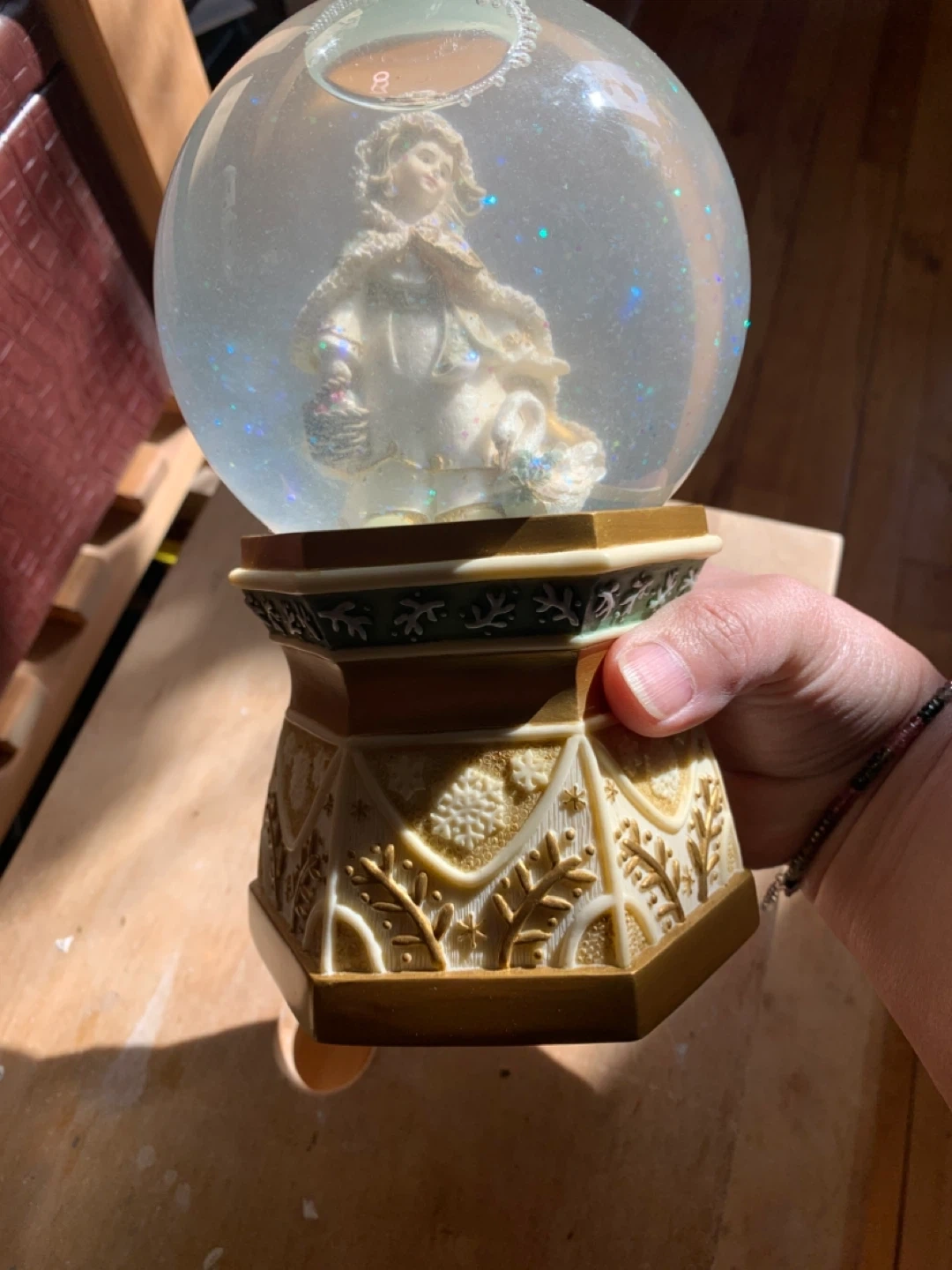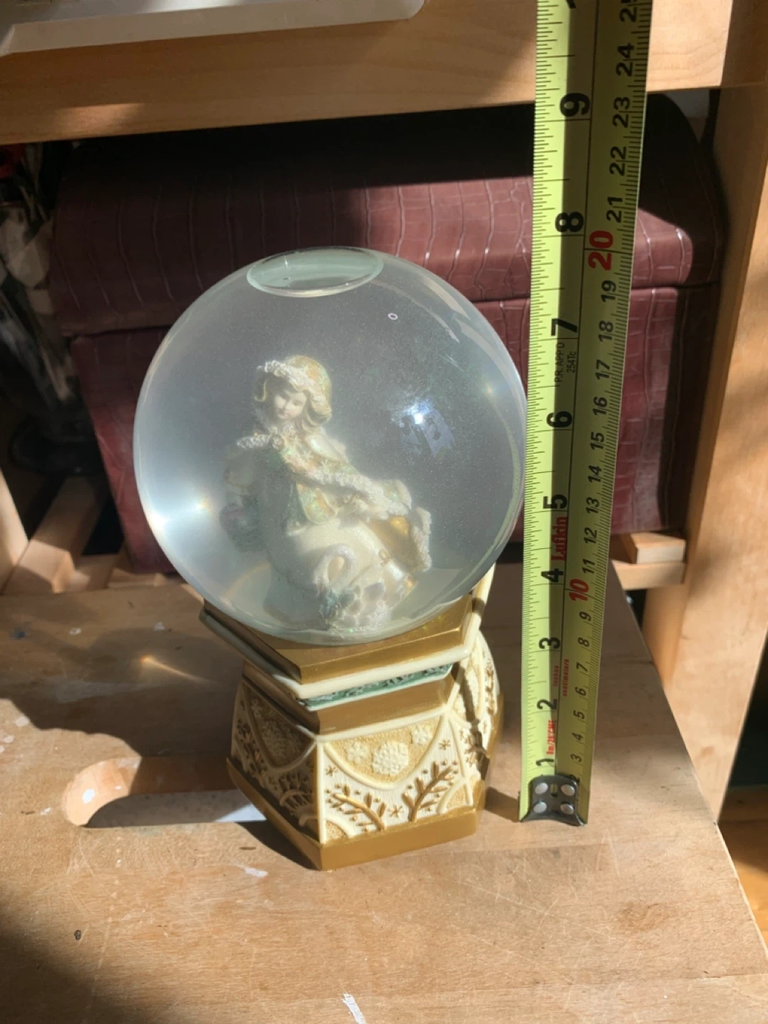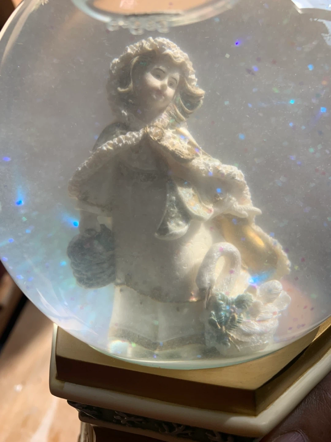 Selling $5 CAD firm. Porcelain musical Snow Globe “Lady with Swan”. The water appears to be a bit cloudy. Otherwise, in great condition. Music works like new. Smoke free home.