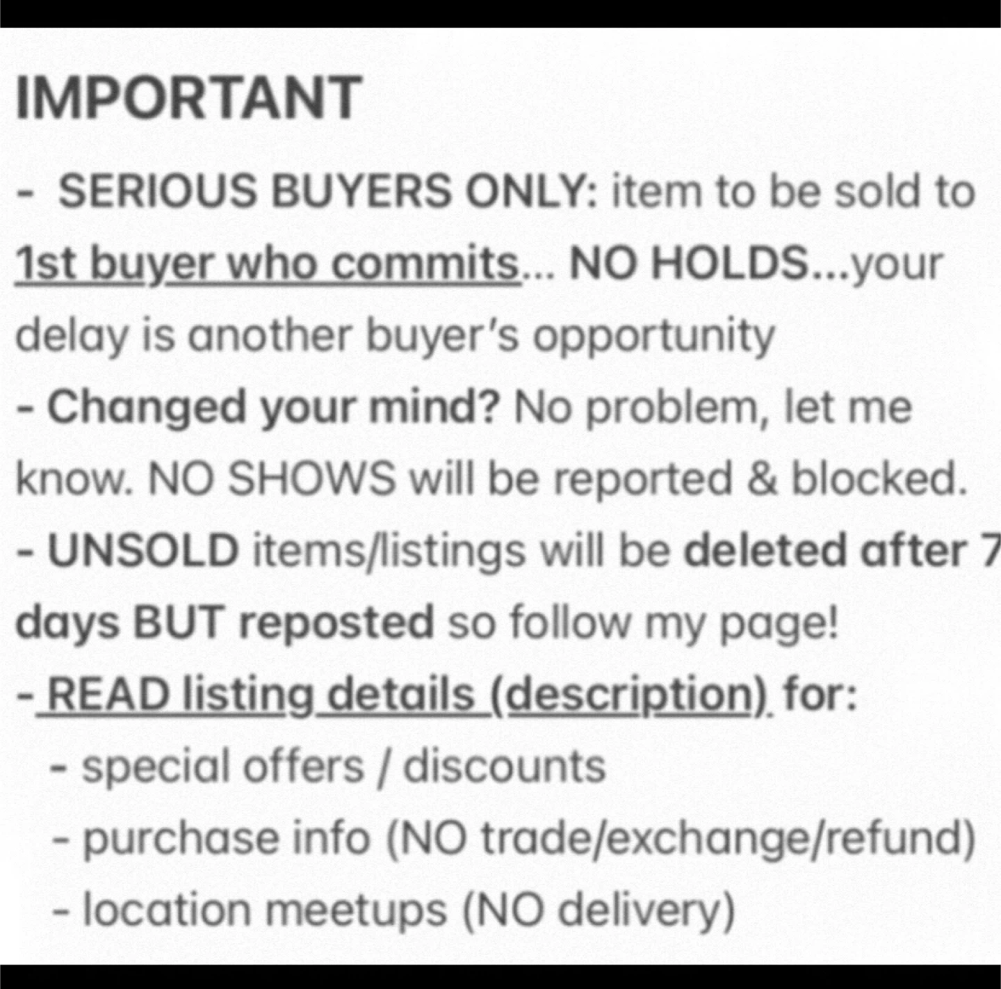 SERIOUS BUYERS ONLY / FINAL SALE / Cash Payment at pickup / NO HOLDS (Items will be sold on a FIRST-COME/PAYMENT-FIRST-SERVE basis!)