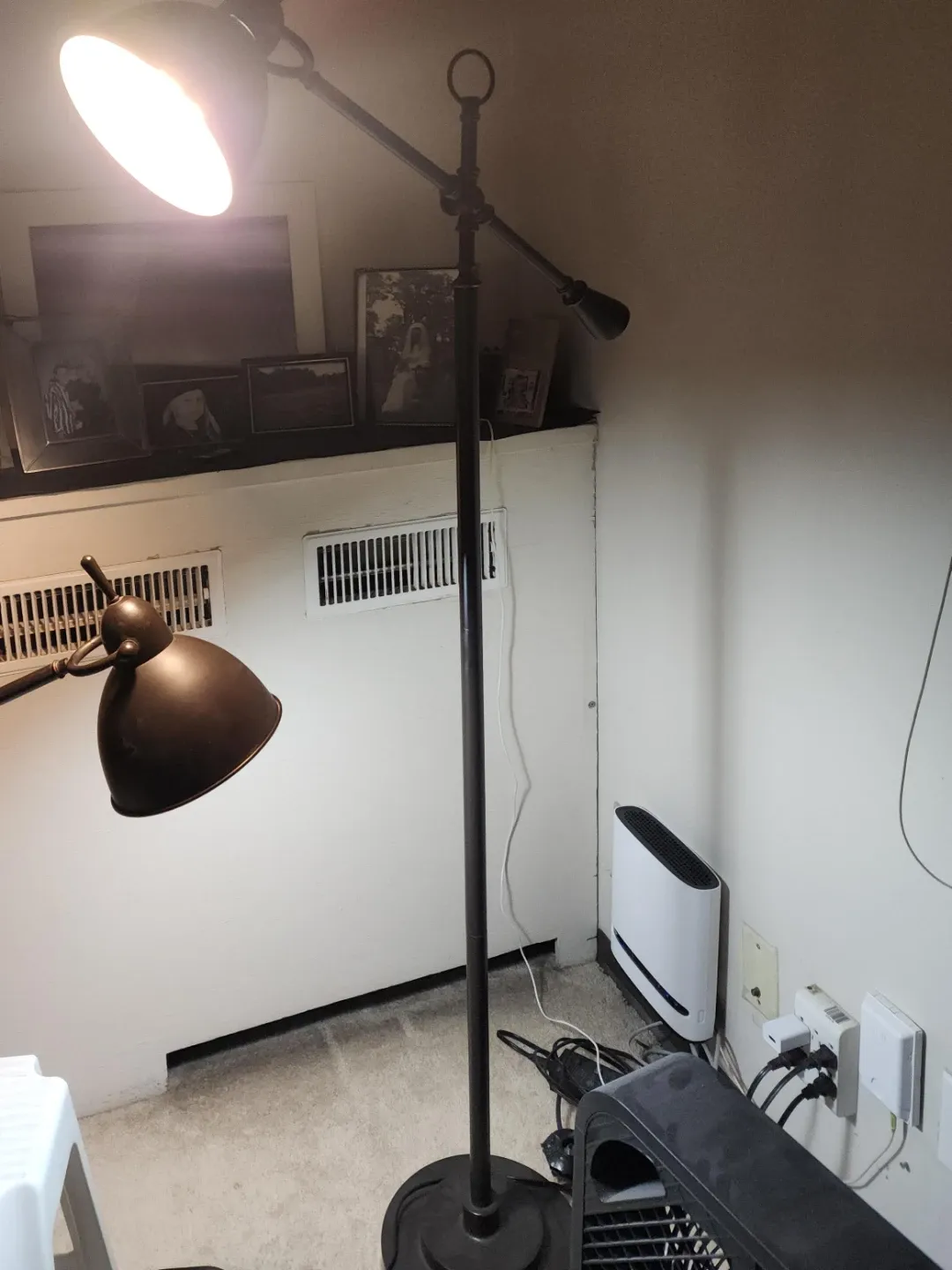 Selling a used adjustable floor lamp and matching table lamp It's bronze metal and in good working condition. Perfect for adding some extra light to any room! Floor lamp step on light switch needs a little wiggle from time to time