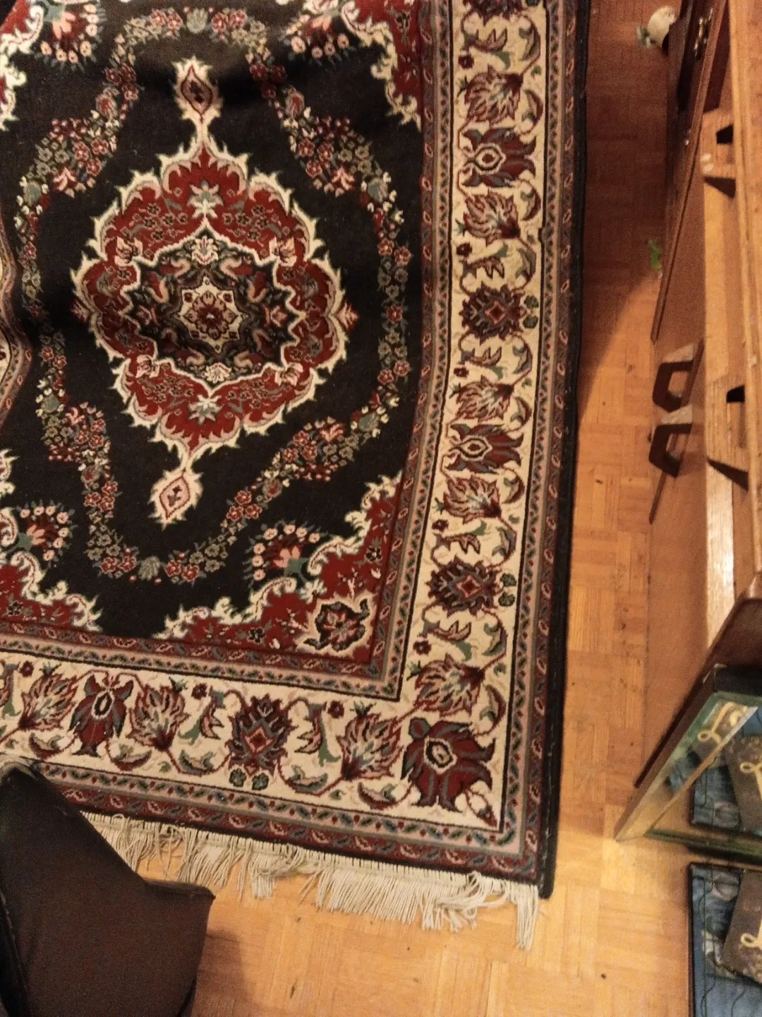 Persian style heirloom area rug with a dark background and red floral designs. It has a fringed edge. Perfect for adding a touch of warmth to any room!