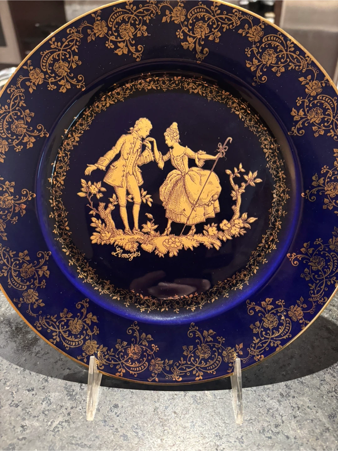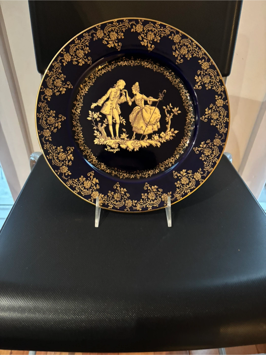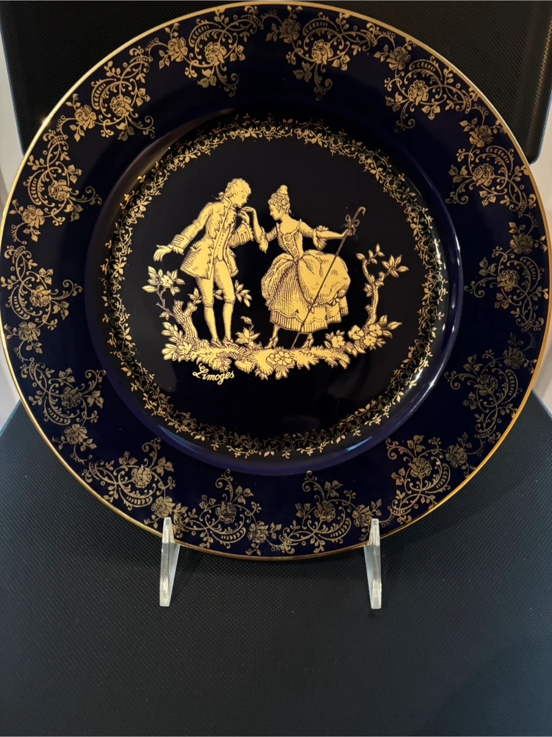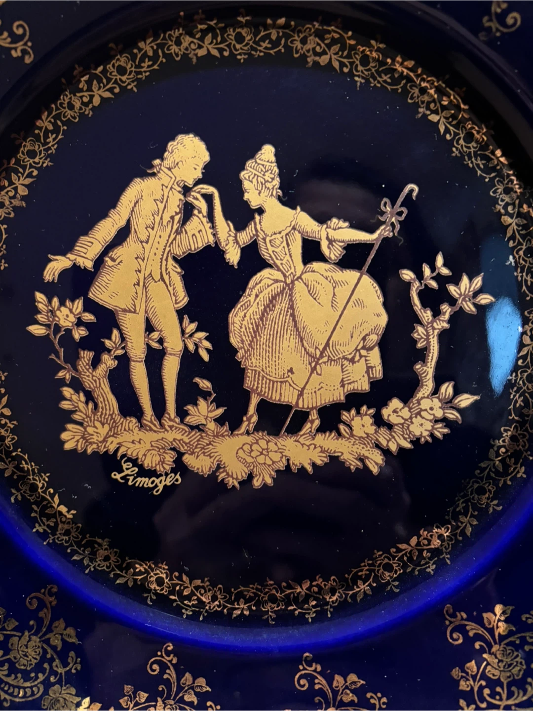 Beautiful Limoges decorative plate featuring a classic design in gold on a deep blue background. Perfect for adding a touch of elegance to your home!
