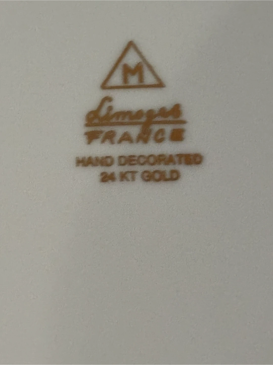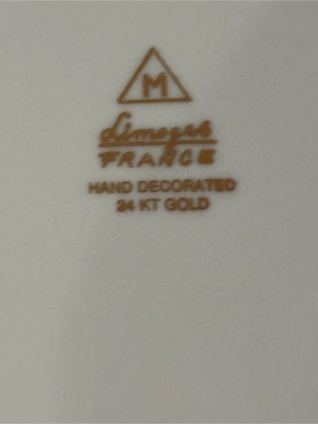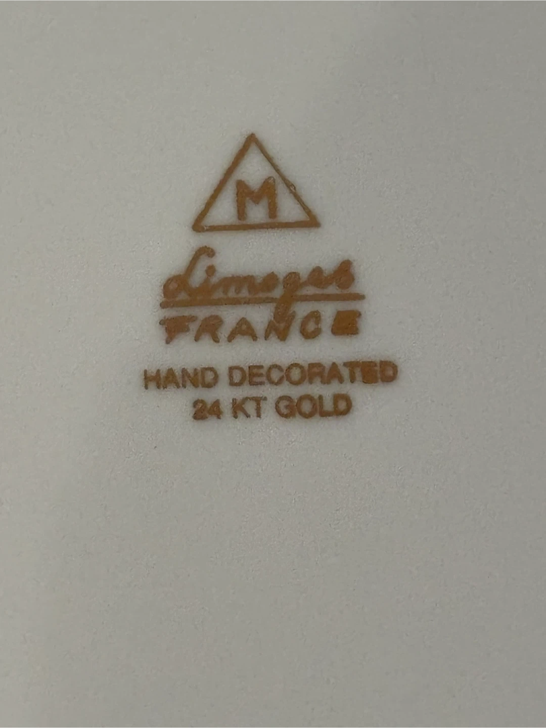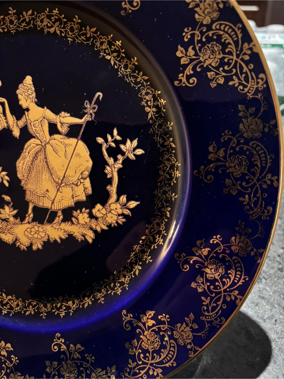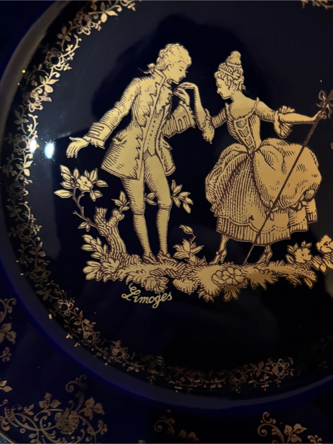 Beautiful Limoges decorative plate featuring a classic design in gold on a deep blue background. Perfect for adding a touch of elegance to your home!