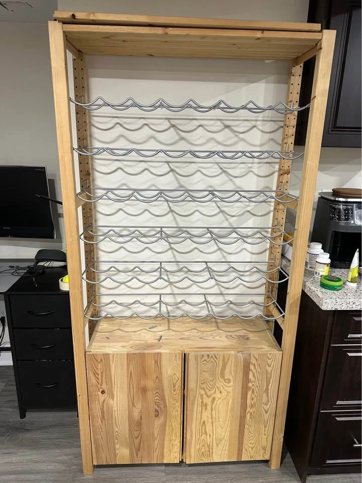 Sold pine wine rack. Holds 48 bottles and more below in cabinet. Easy to transport and will be disassembled.