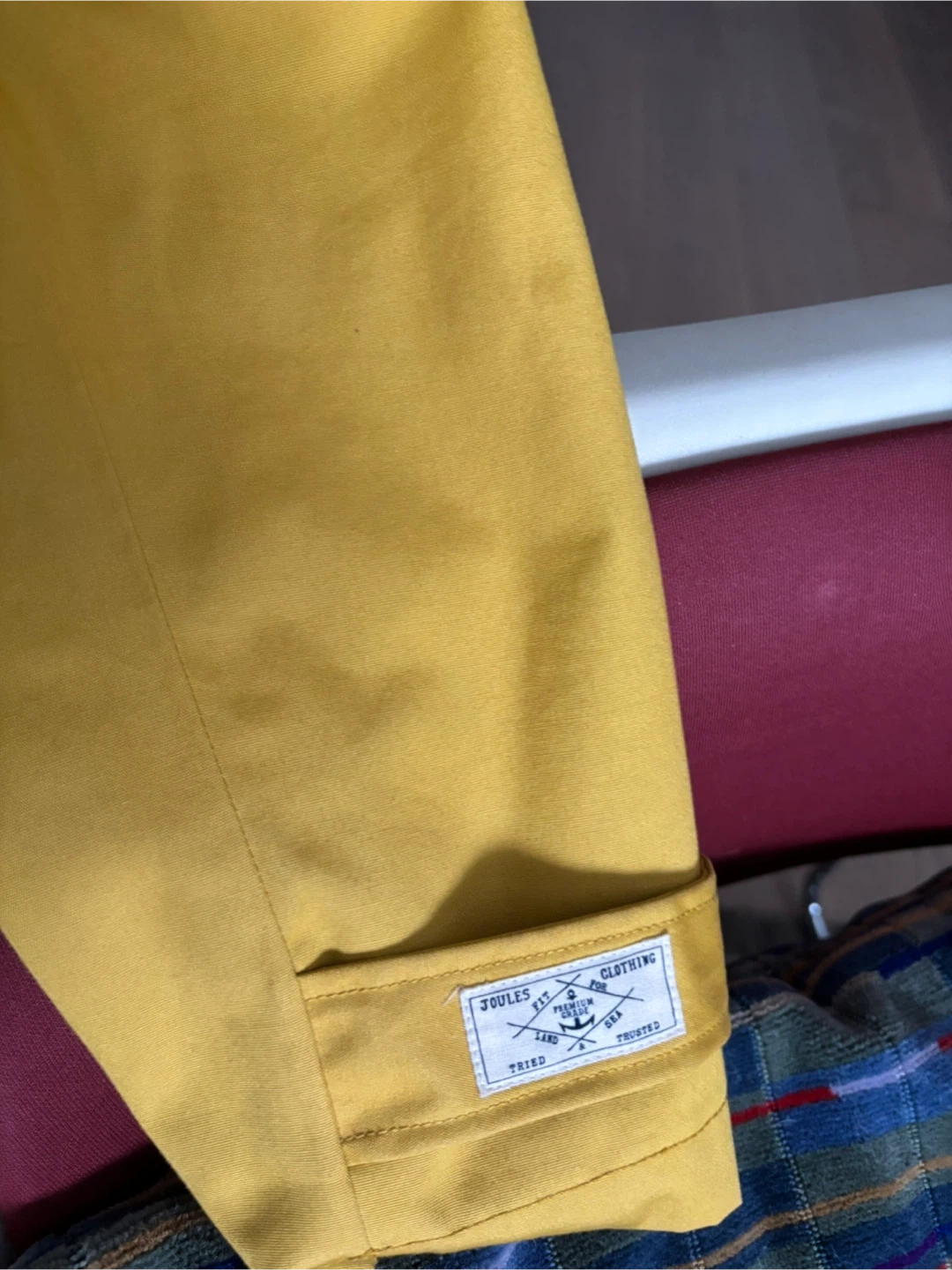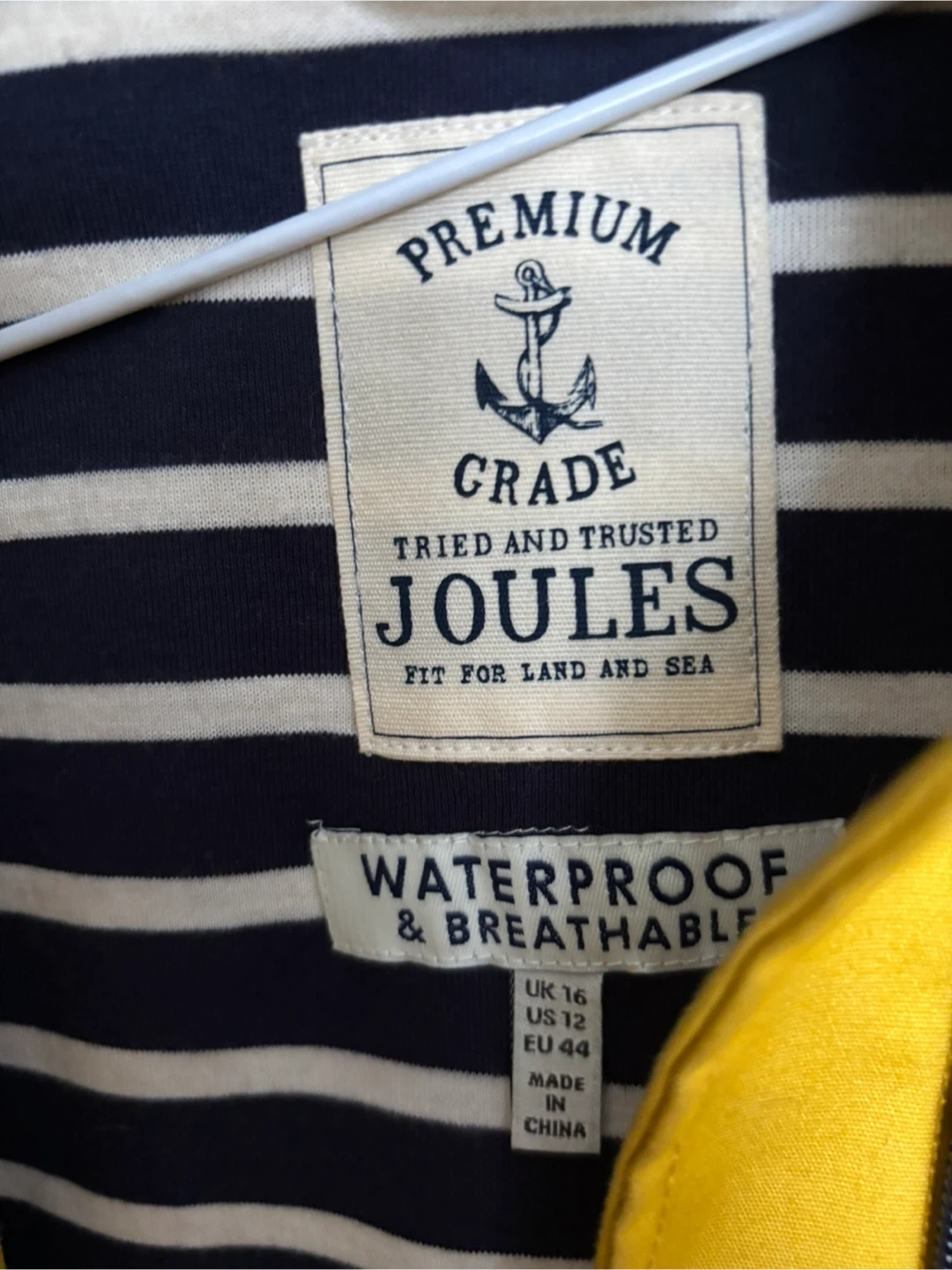 Selling a Joules waterproof and breathable jacket in yellow! It's a size UK 16, EU 44, US 12. This jacket is perfect for those rainy days!
