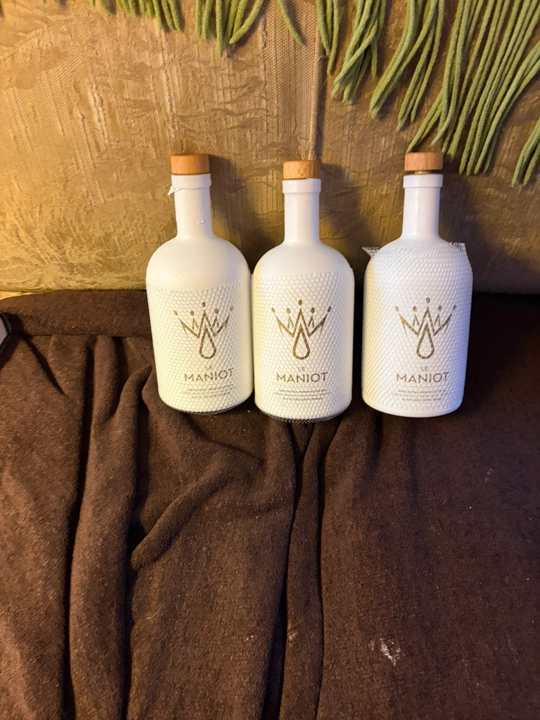Selling three Le Maniot olive oil bottles. They have a unique design and would look great in any kitchen. Perfect for adding a touch of elegance to your cooking!