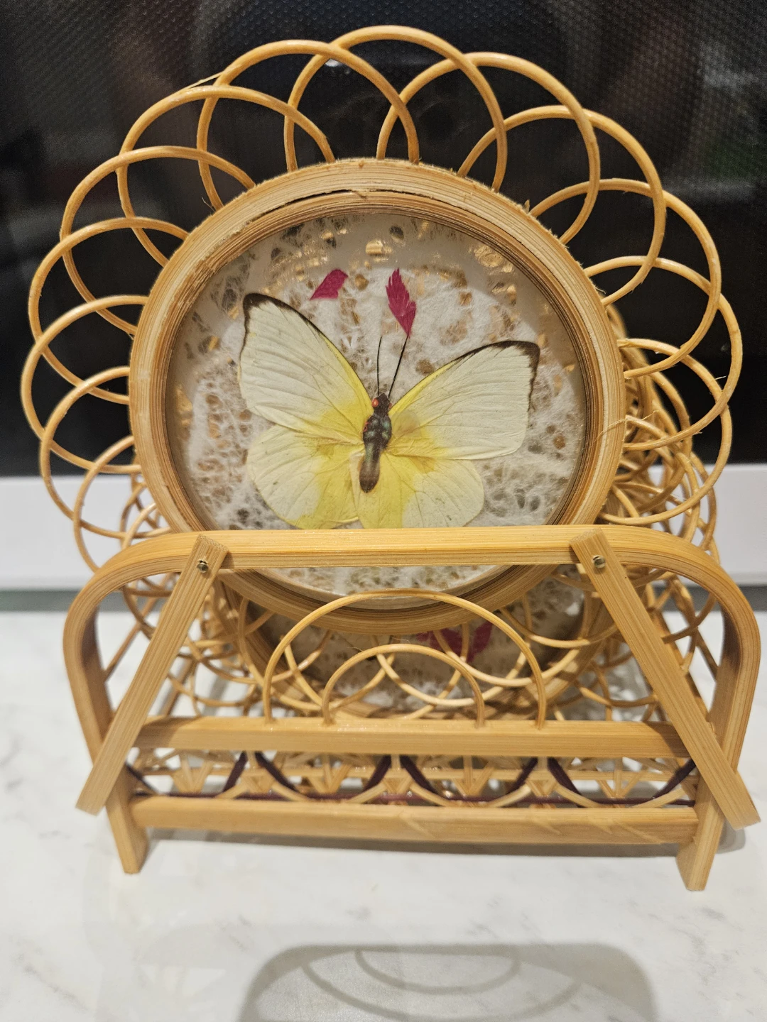 Here's a cute wicker coaster set featuring a butterfly design! It comes with a stand to keep the coasters organized. Perfect for adding a touch of nature to your coffee table or dining area