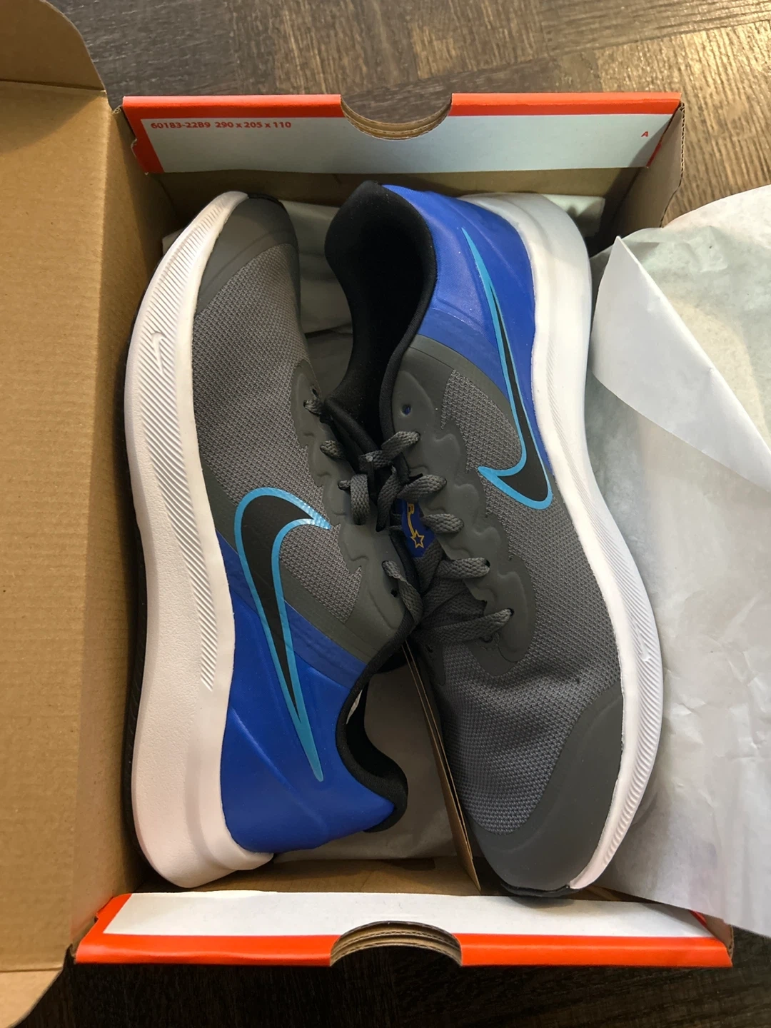 Selling a pair of Women’s brand new Nike Star Runner 3 (GS) in size 7Y. The colours are Iron Grey/Black-Blue Lightning. They come with the original box!