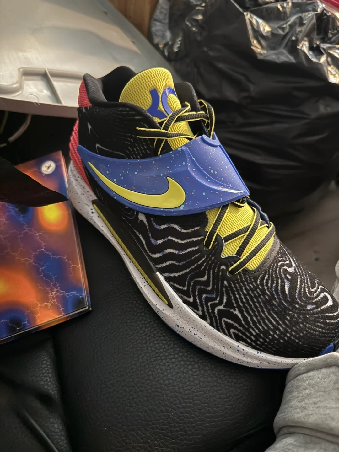 Selling a pair of Nike KD Trey 5 IX basketball shoes. They feature a unique black and white wavy pattern with yellow and blue accents. Great for on the court or casual wear!