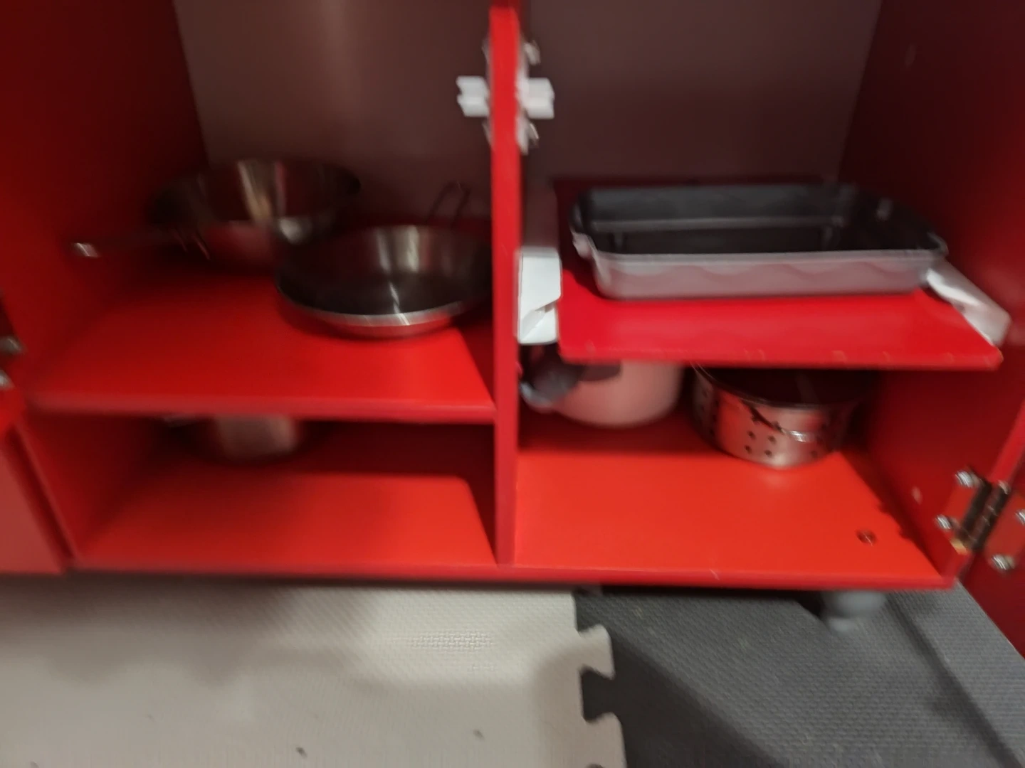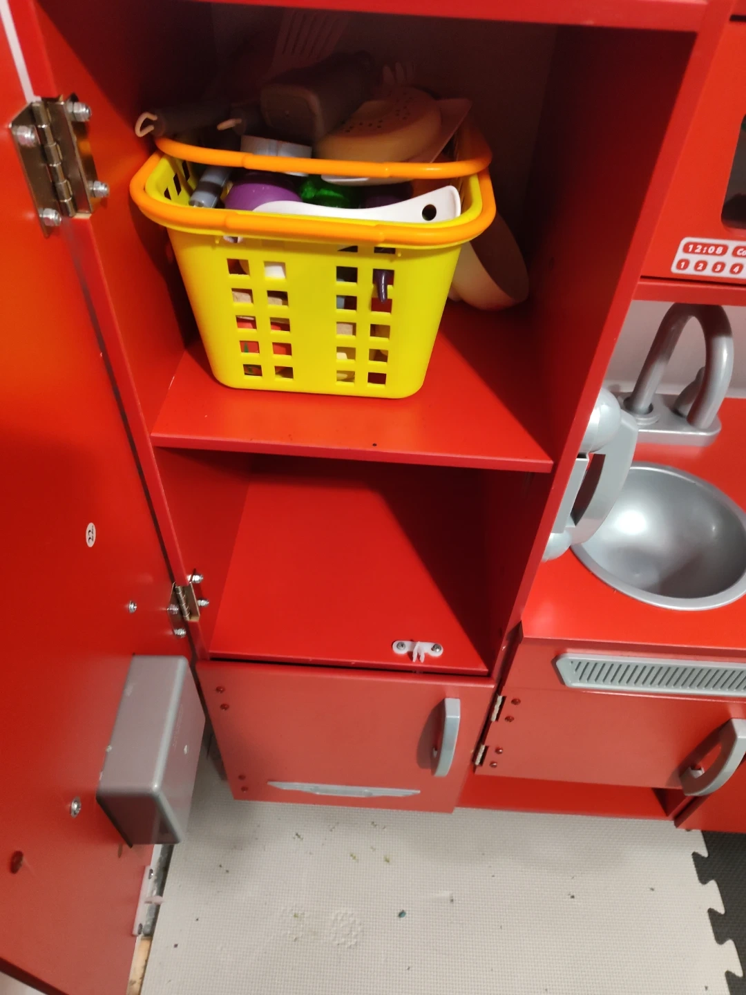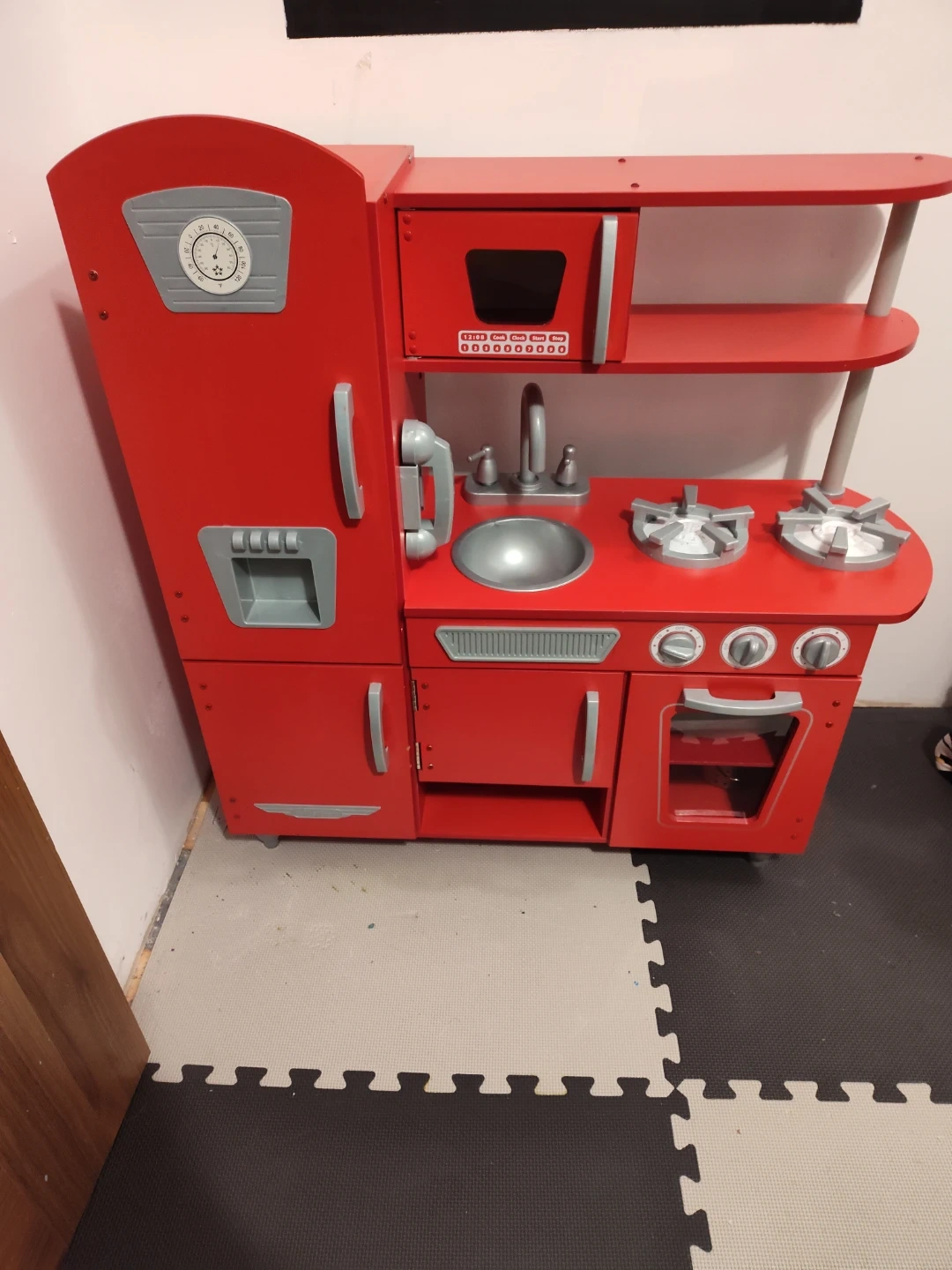 Here's a super fun red wooden kidkraft kitchen set! It's perfect for little chefs to play and explore their culinary creativity. It includes a sink, stove, oven, microwave, and a fridge. Lots of storage space for pots, pans, and other play food too!
