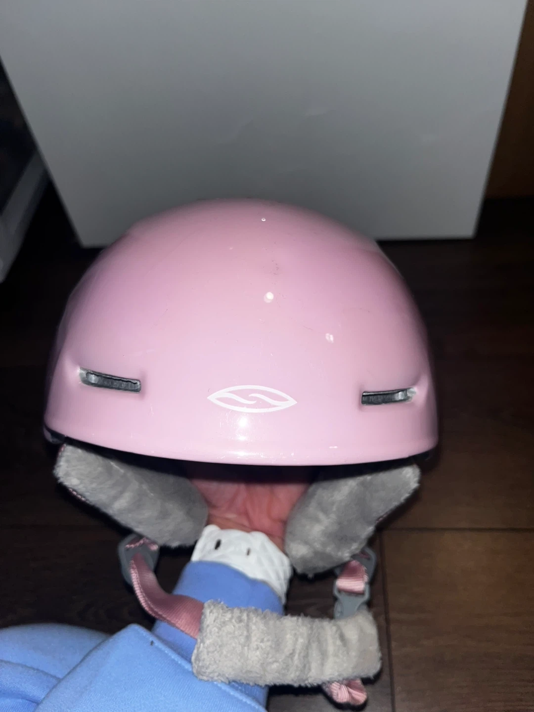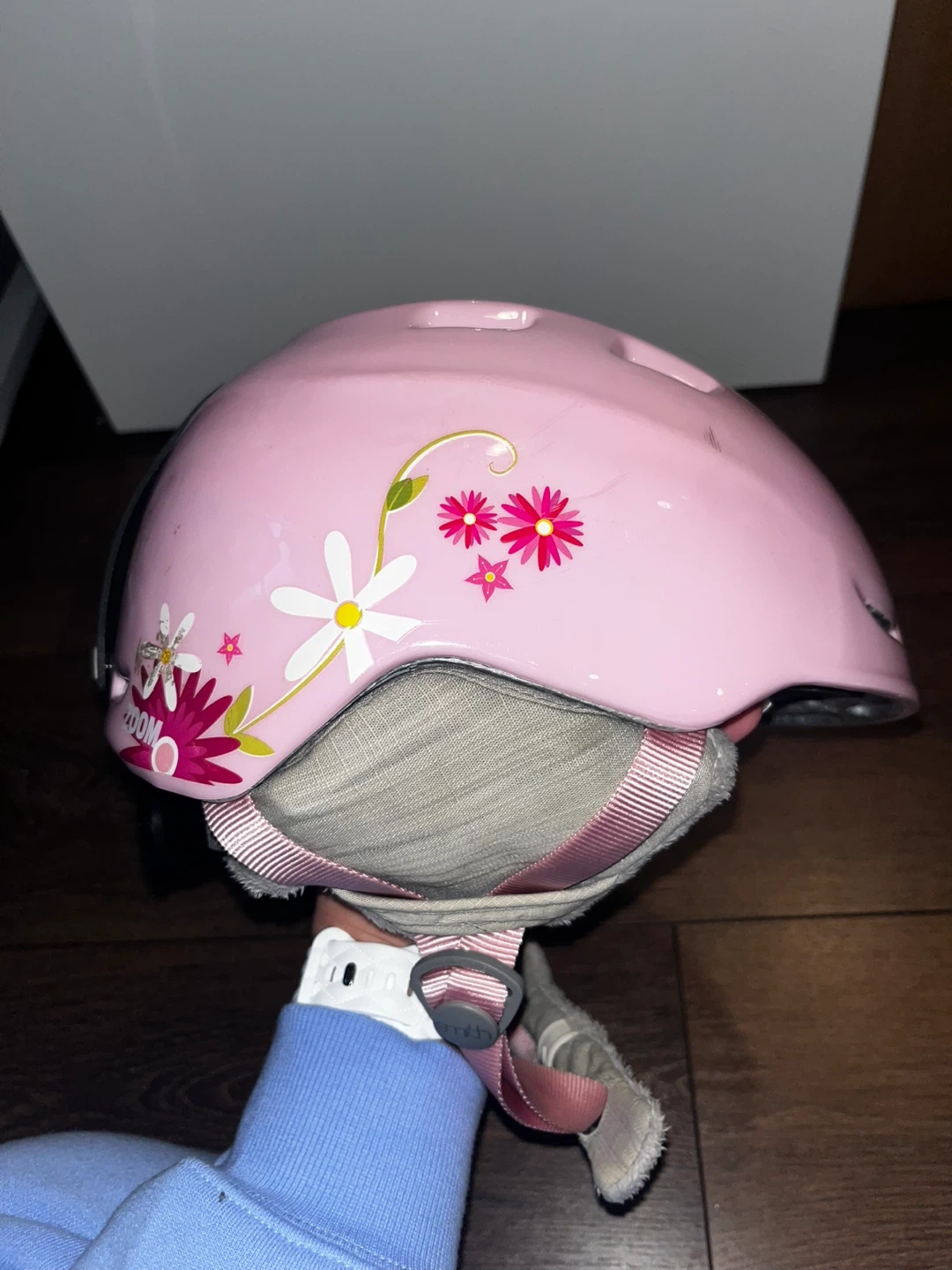 Selling a Smith Zoom Jr. ski helmet in pink with a cute floral stickers. It's a youth size Y/S, fitting head circumferences of 48-53cm. Great for keeping your little one safe and stylish on the slopes!