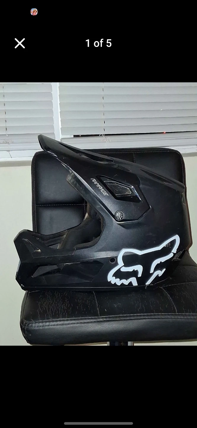 Selling a Fox Rampage full face helmet in black. It has the Fox logo on the side and looks to be in good condition. Perfect for mountain biking or other extreme sports!