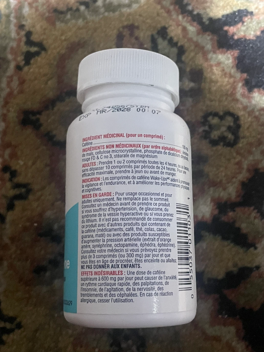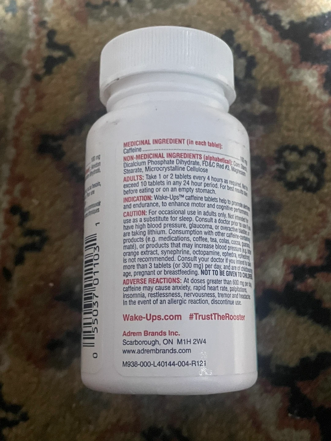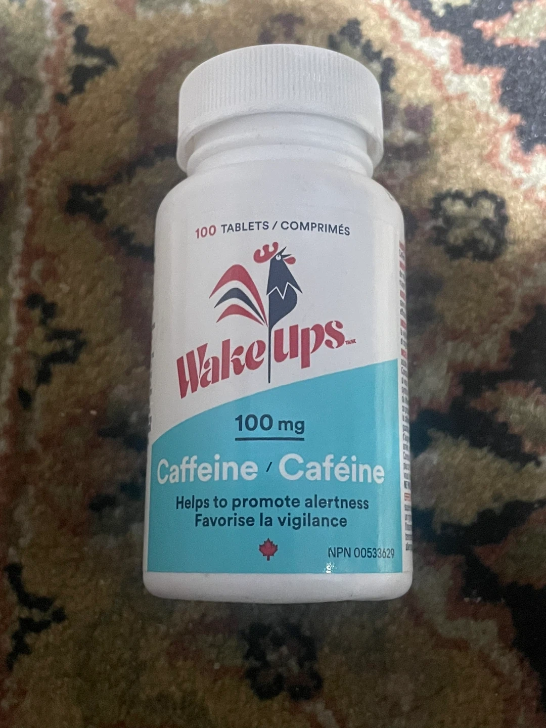 Selling a bottle of Wake-Ups Caffeine tablets, each containing 100mg of caffeine. The bottle contains 100 tablets. Expiry Date is March 2028. Helps to promote alertness and reduce fatigue