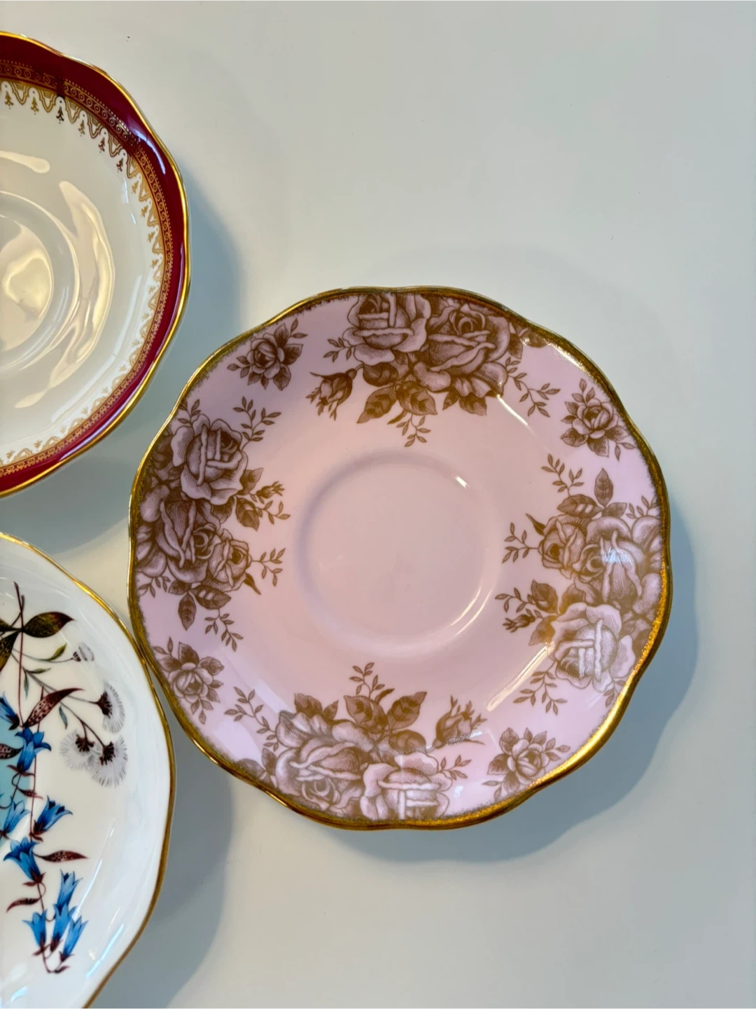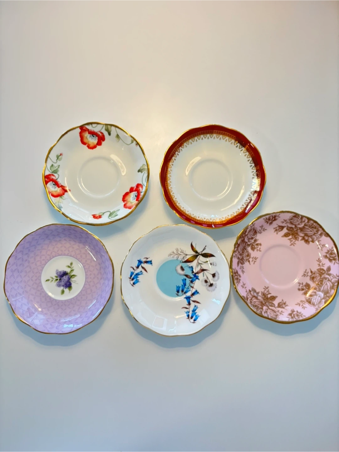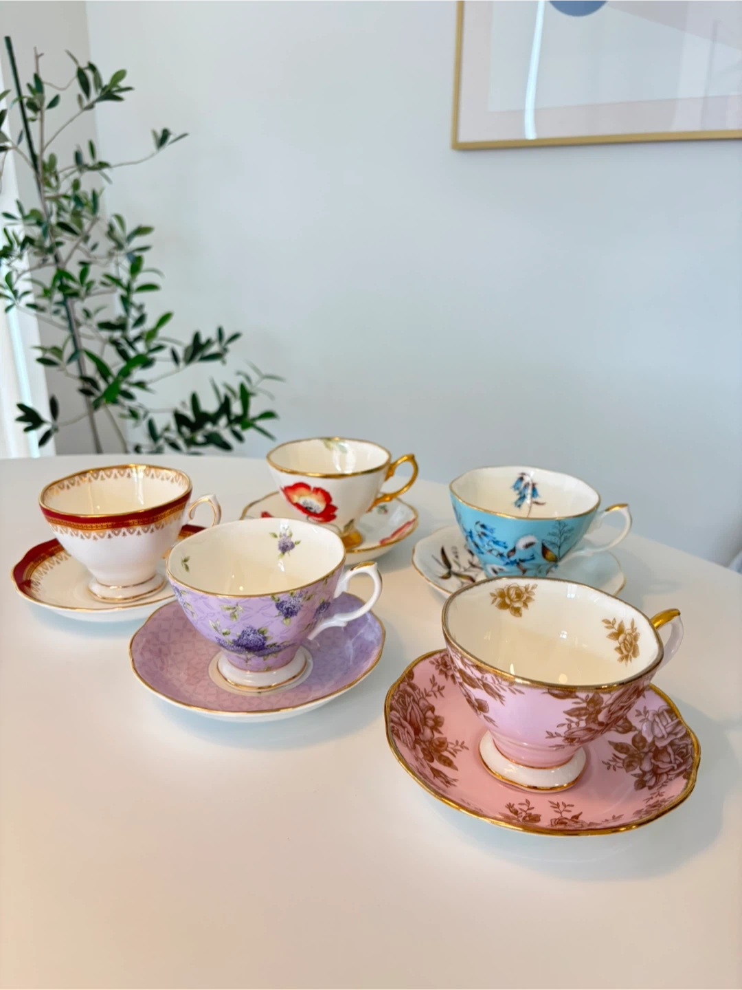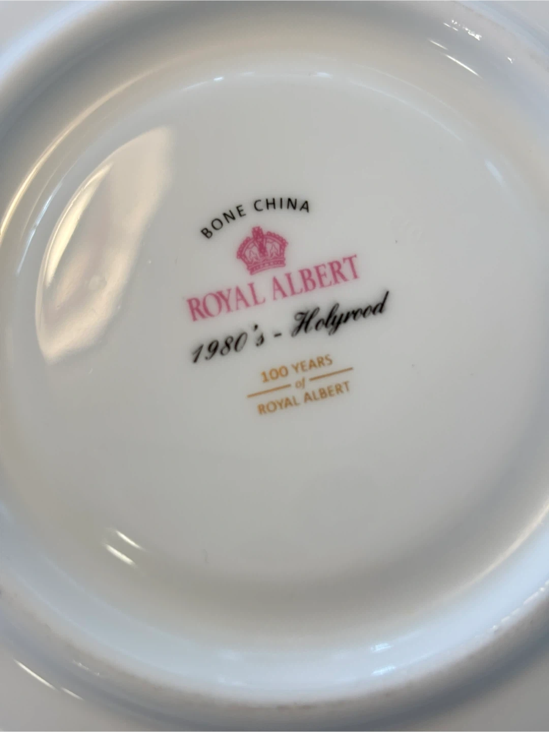 Beautiful "100 Years of Royal Albert" tea cup and saucer collection. This set features five iconic designs representing different decades. All pieces are in excellent condition with no chips, cracks, or crazing. The gold rims are well-preserved.
