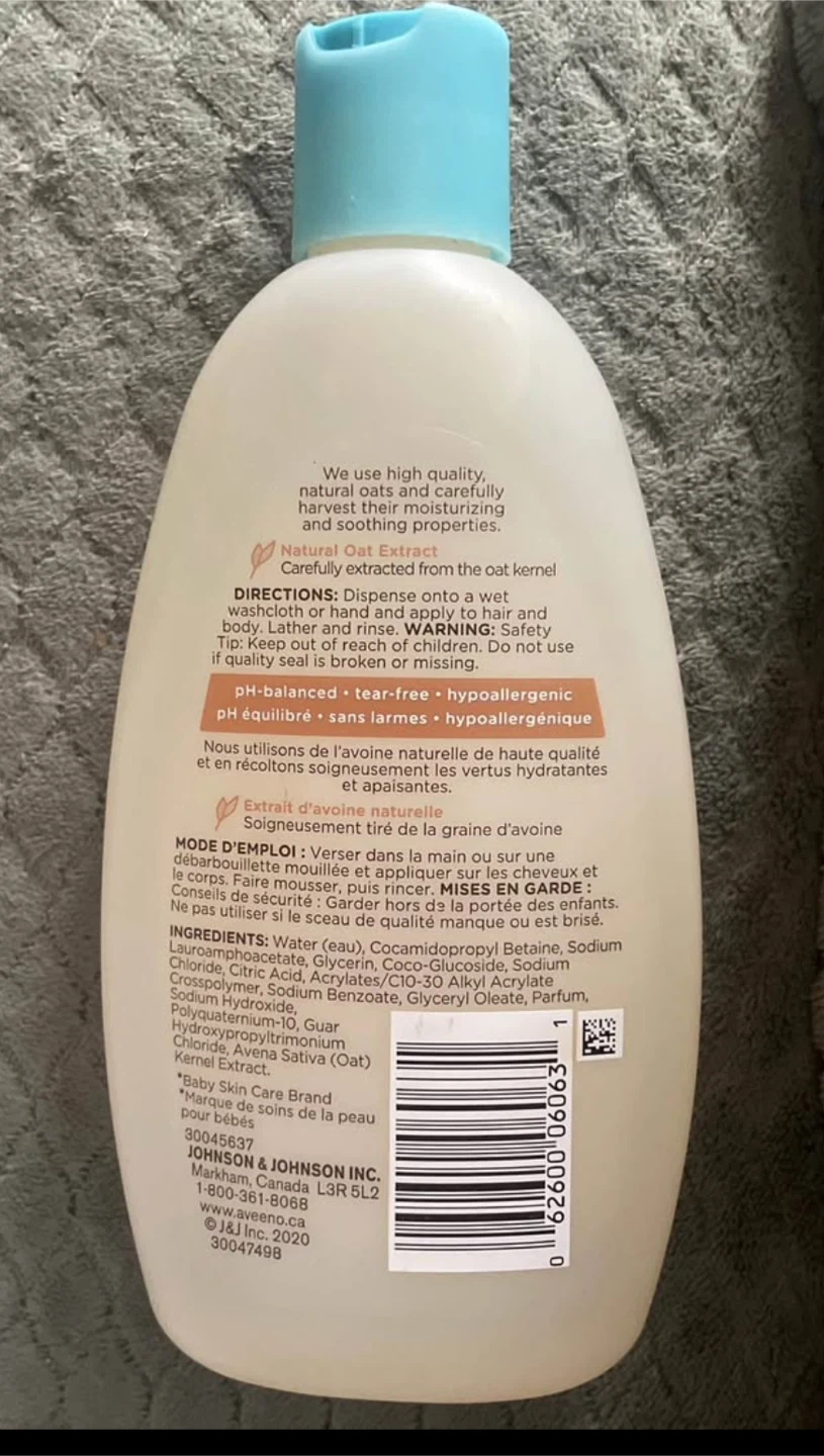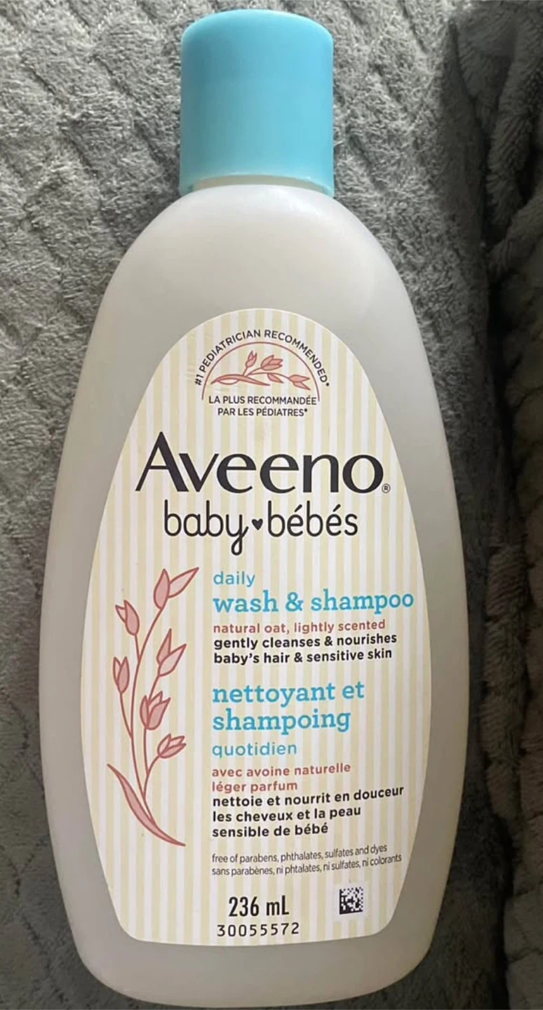 Aveeno Baby Daily Wash & Shampoo with natural oat extract gently cleanses and nourishes baby's hair and sensitive skin. It's tear-free, hypoallergenic, and pH-balanced. Free of phthalates, sulfates, and dyes, and lightly scented with a light fragrance. 236 mL bottle