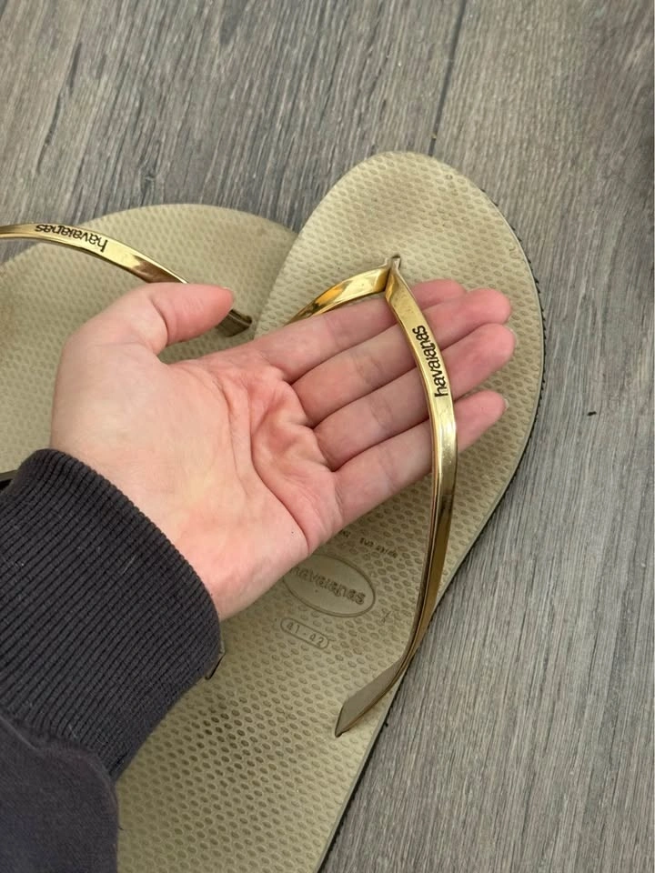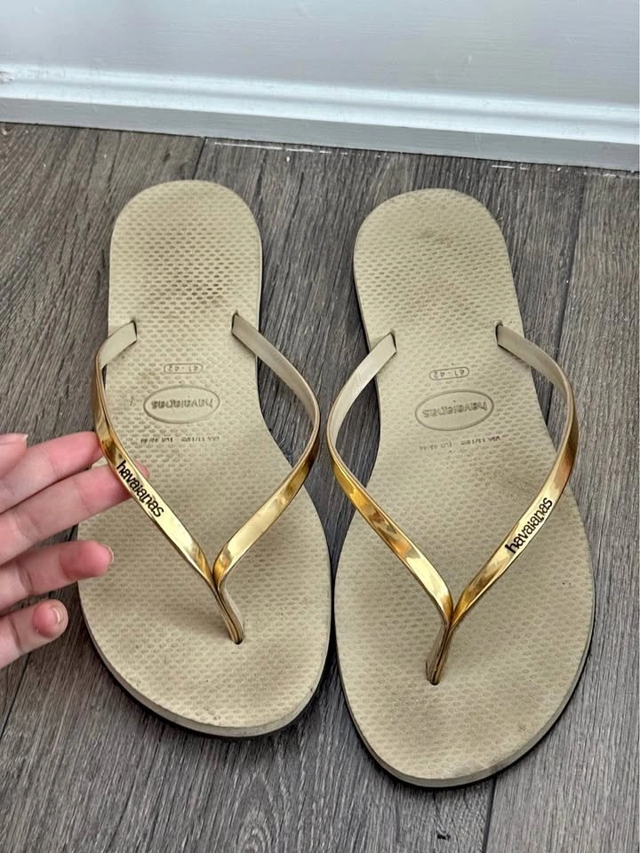 Havaianas flip flops with metallic gold straps — women’s size 11/12 (EUR 41–42), wide. Only worn a few times this summer, well taken care of. Originally 45$ CAD, priced low for a quick sale.