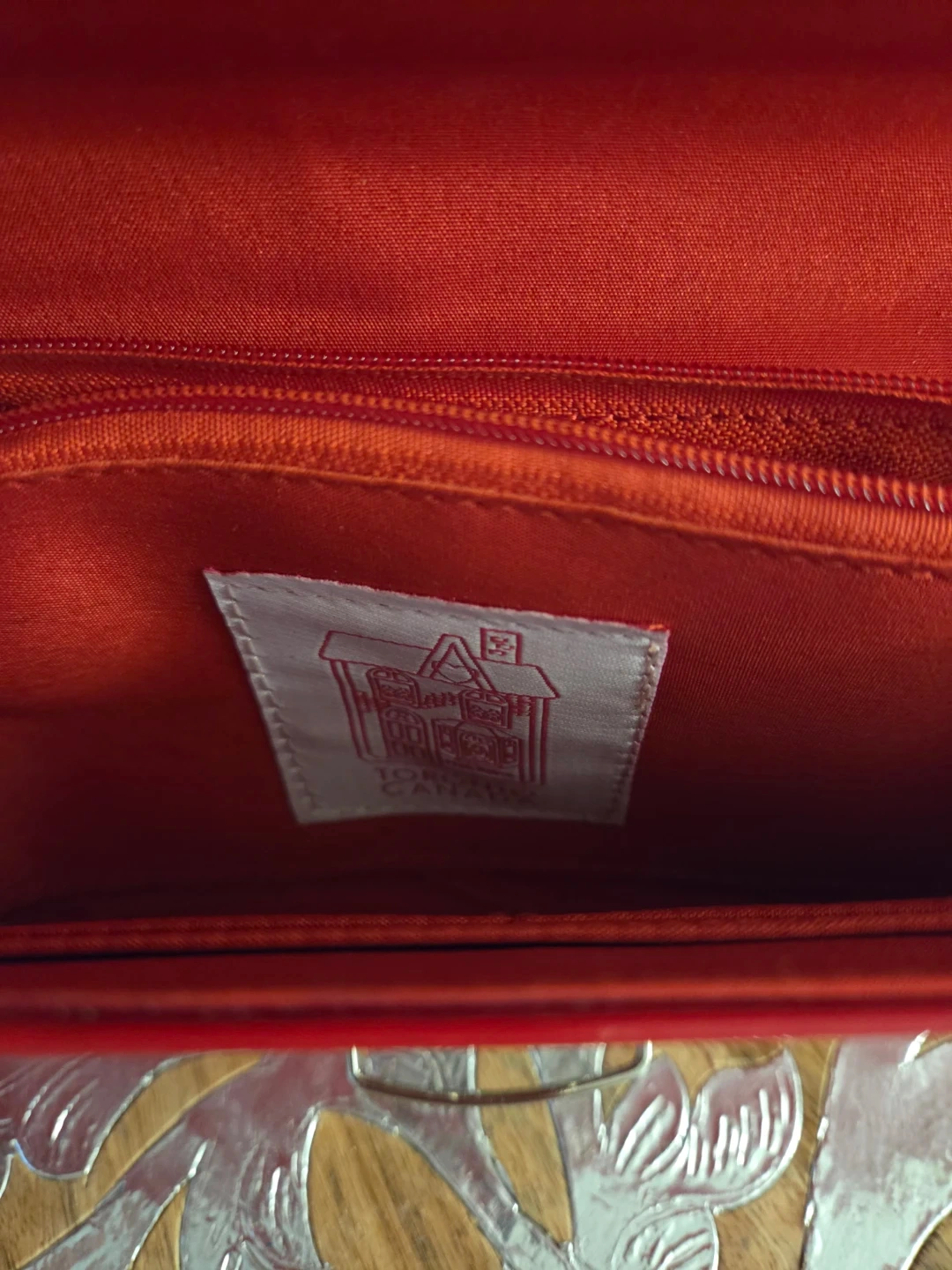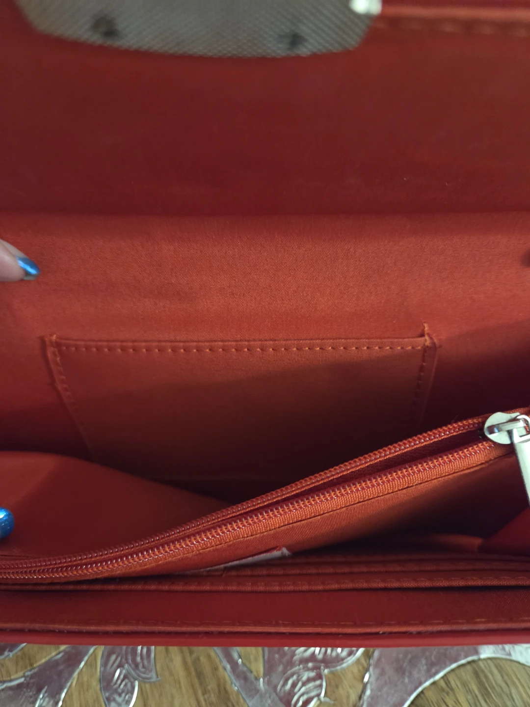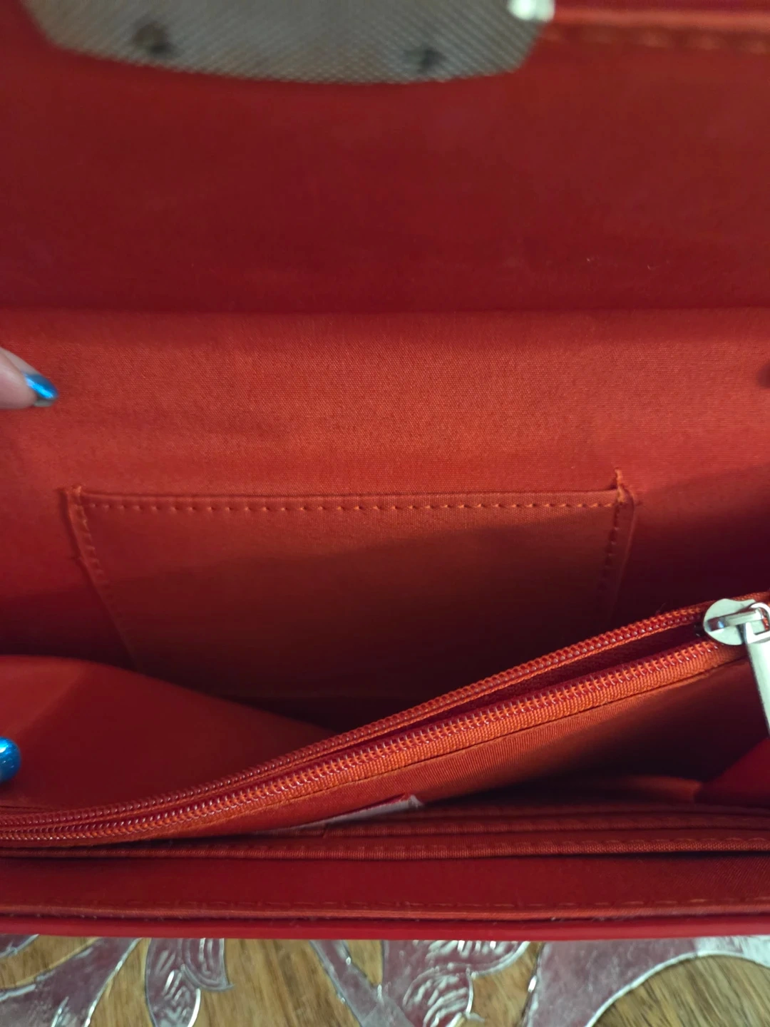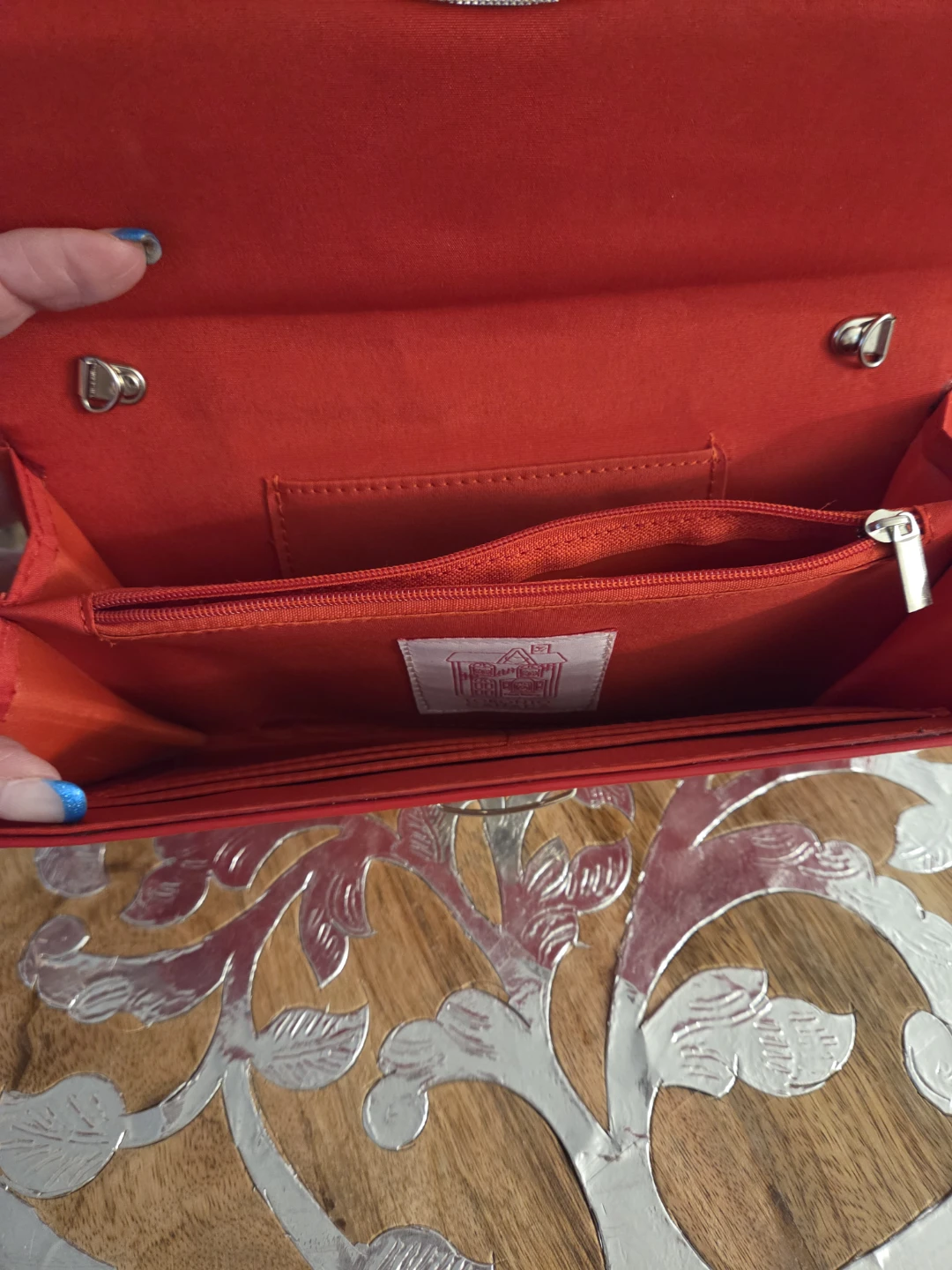 Here's a cute red clutch bag! It's perfect for a night out or a special occasion. The interior has a zippered pocket and a few other compartments to keep your belongings organized