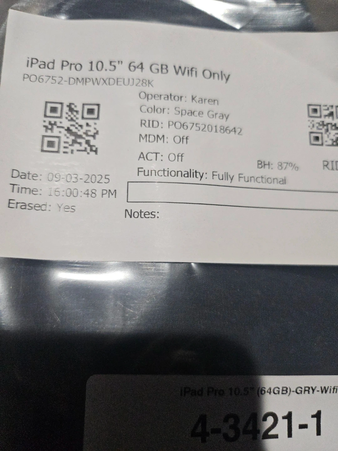 Selling a used iPad Pro 10.5 inch with 64GB of storage. It's the WiFi only model in Space Gray. Functionality is fully functional and battery health is at 87%.