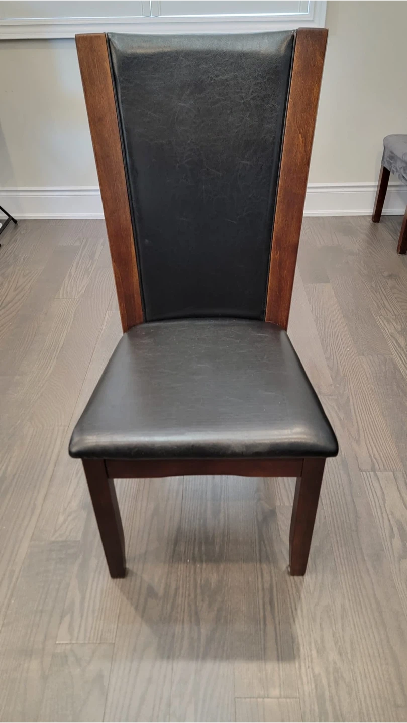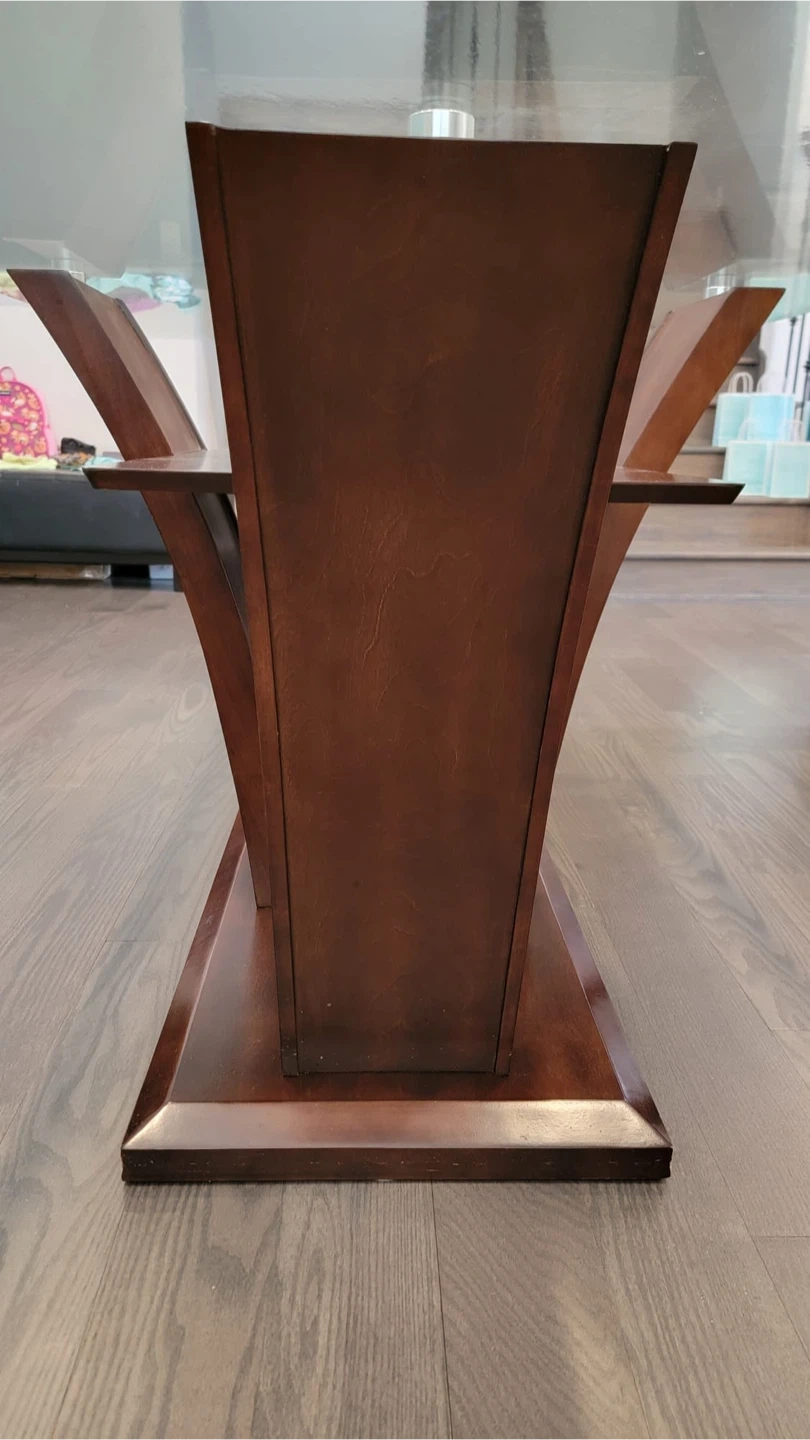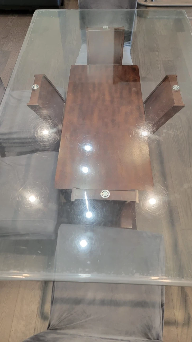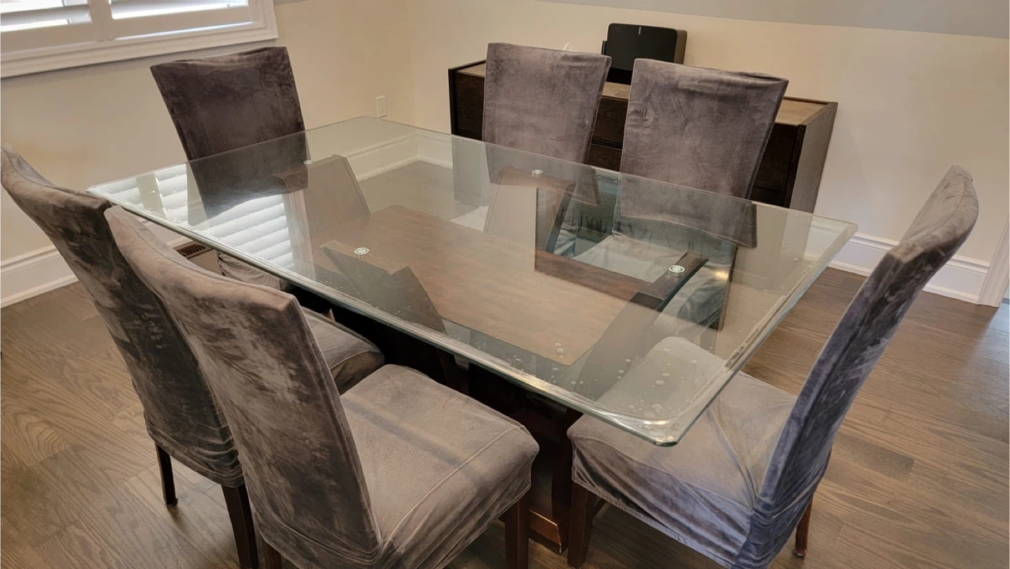 Selling a dining table with a glass top and a wooden base. (42” x 72”). The glass top is covered with vinyl protector from day 1 in brand new condition (no scratches). 6 chairs with chair covers in used condition; and 2 chairs in brand new condition are stored never used.