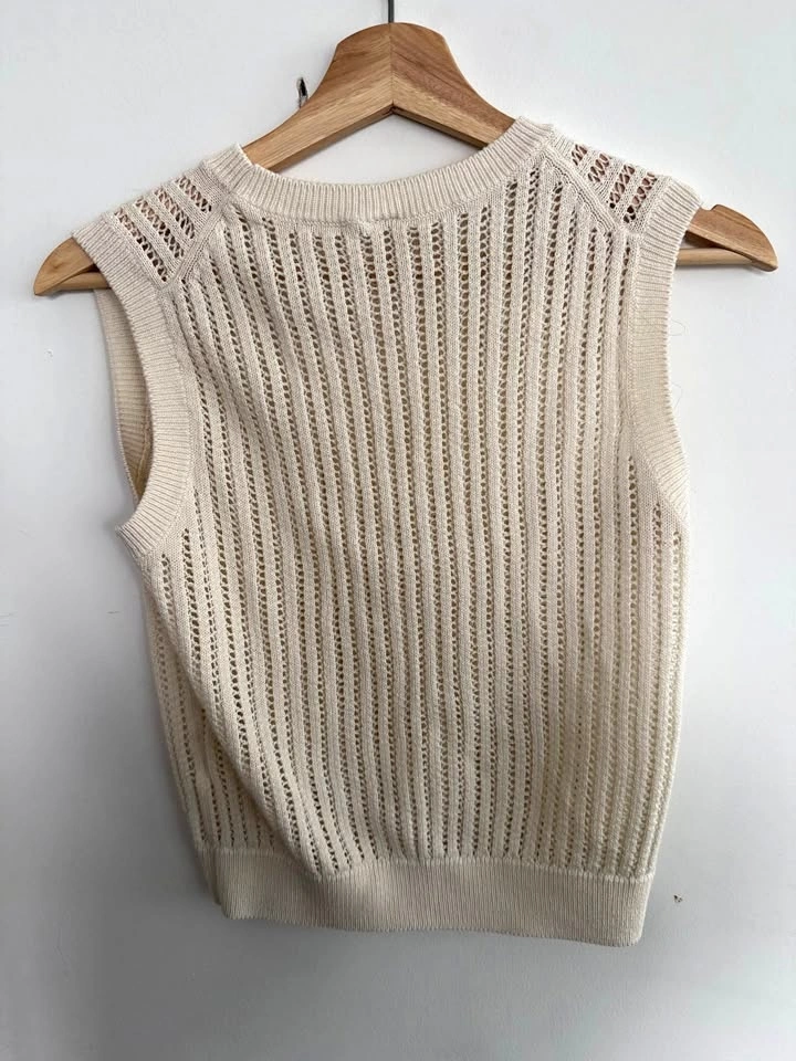 UNIQLO knit sweater vest, women’s size M — soft cream colour with breathable open-knit texture; sleeveless, lightweight, and perfect for layering. Original price approx. $40 selling for $15.
