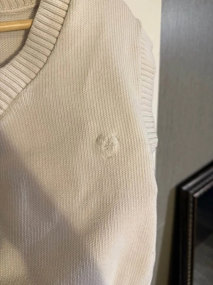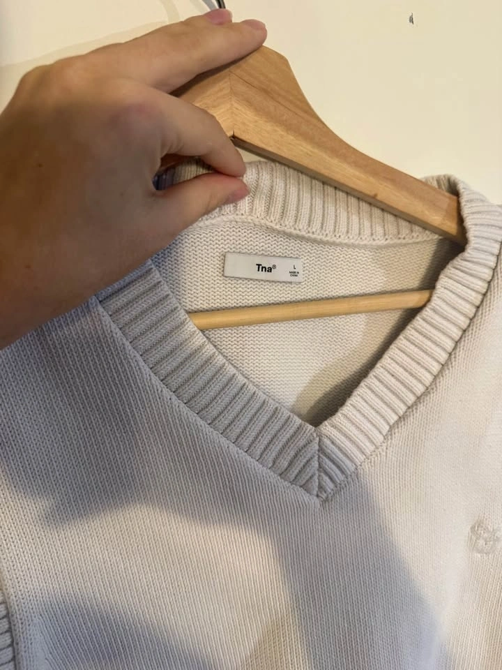 TNA knit sweater vest in a soft cream colour — size L. V-neck, ribbed hem and armholes, with subtle embroidered logo. Well taken care of, no noticeable flaws. Priced at $25 - originally 75$ CAD.