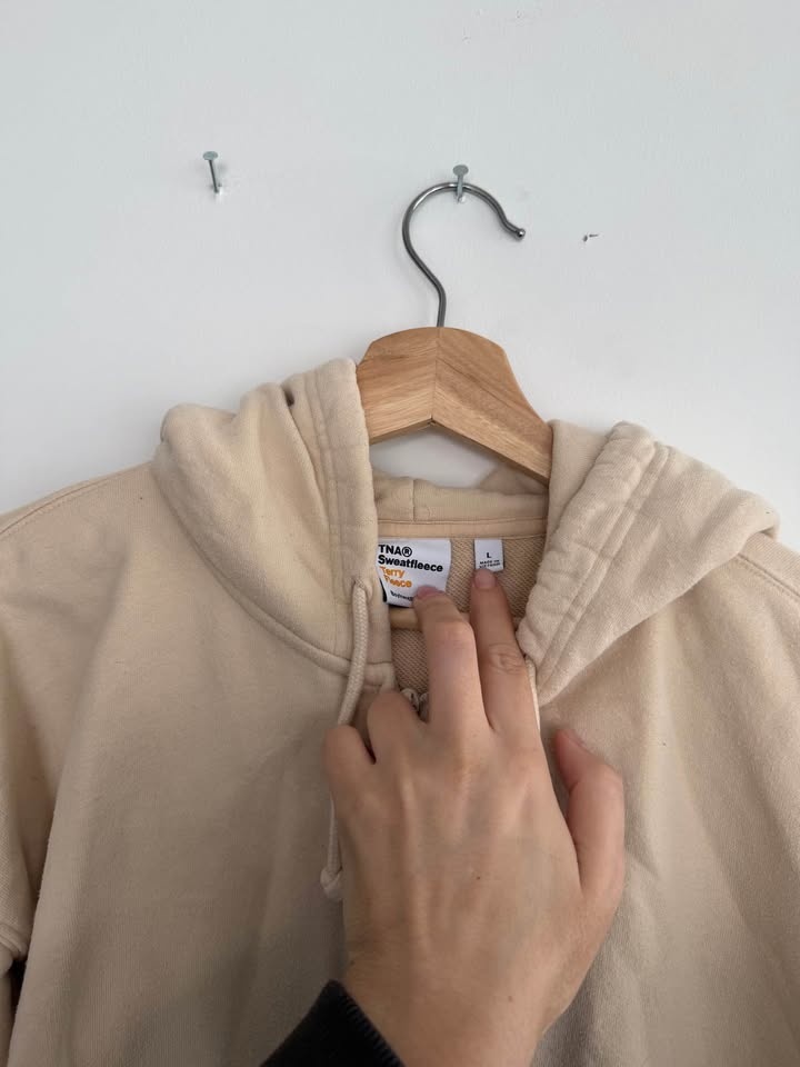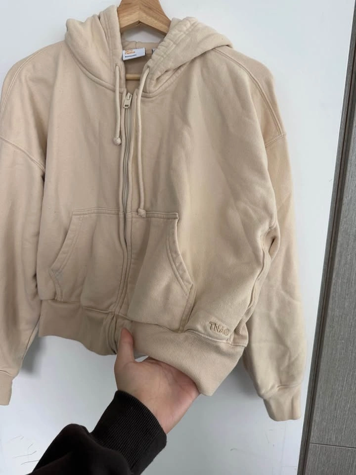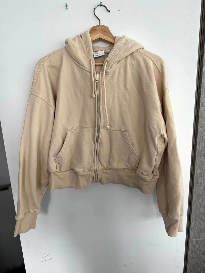 TNA Sweatfleece Terry Fleece zip-up hoodie in beige — women’s size L. Soft, cozy, and comfortable. Well taken care of with light, normal wear.