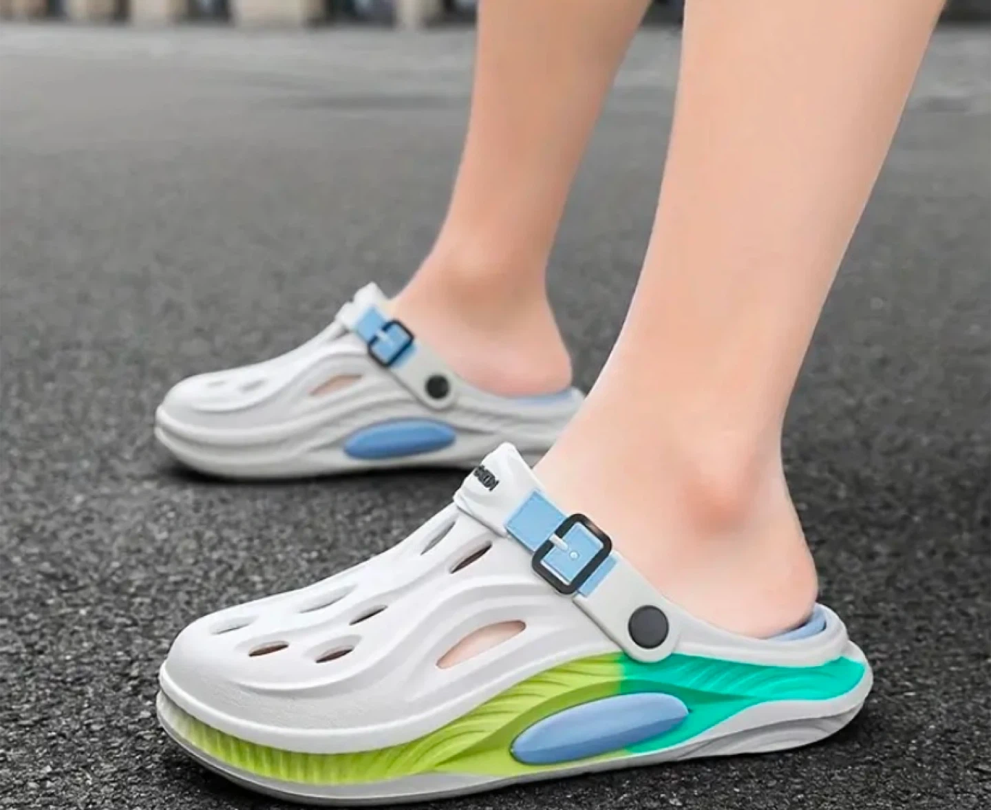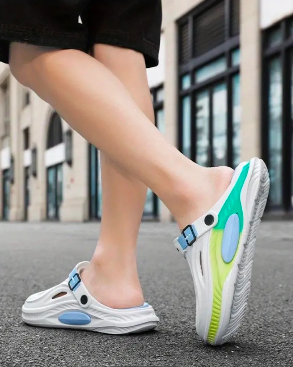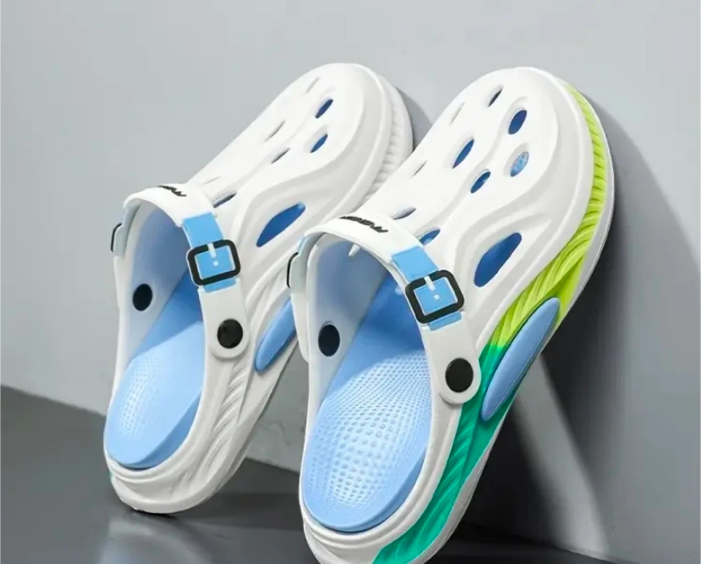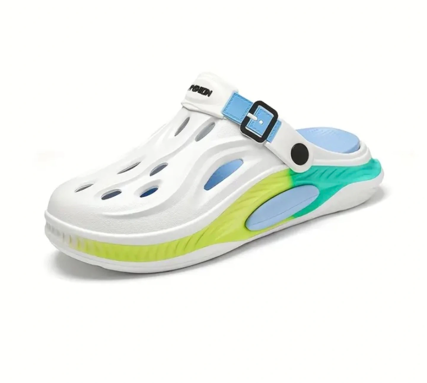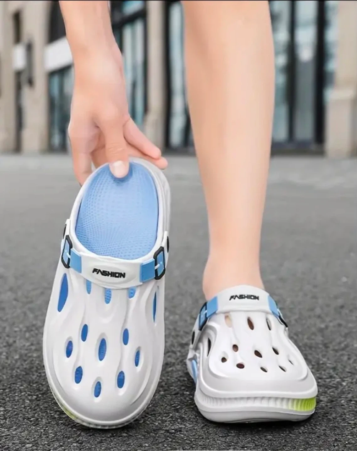 Selling a pair of fashionable clogs in white with blue accents! These are lightweight and comfy, perfect for casual wear. The clogs feature a unique design with vent holes and an adjustable buckle strap. Great for summer!