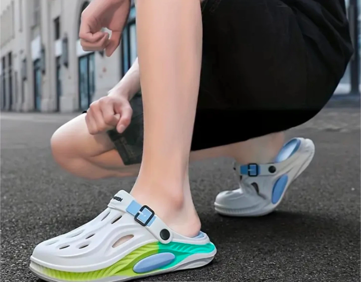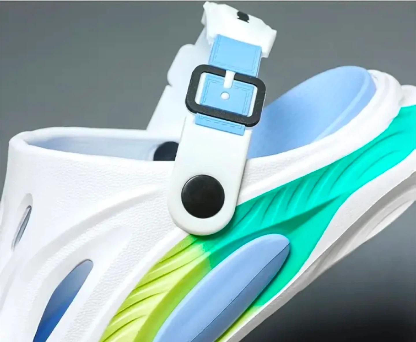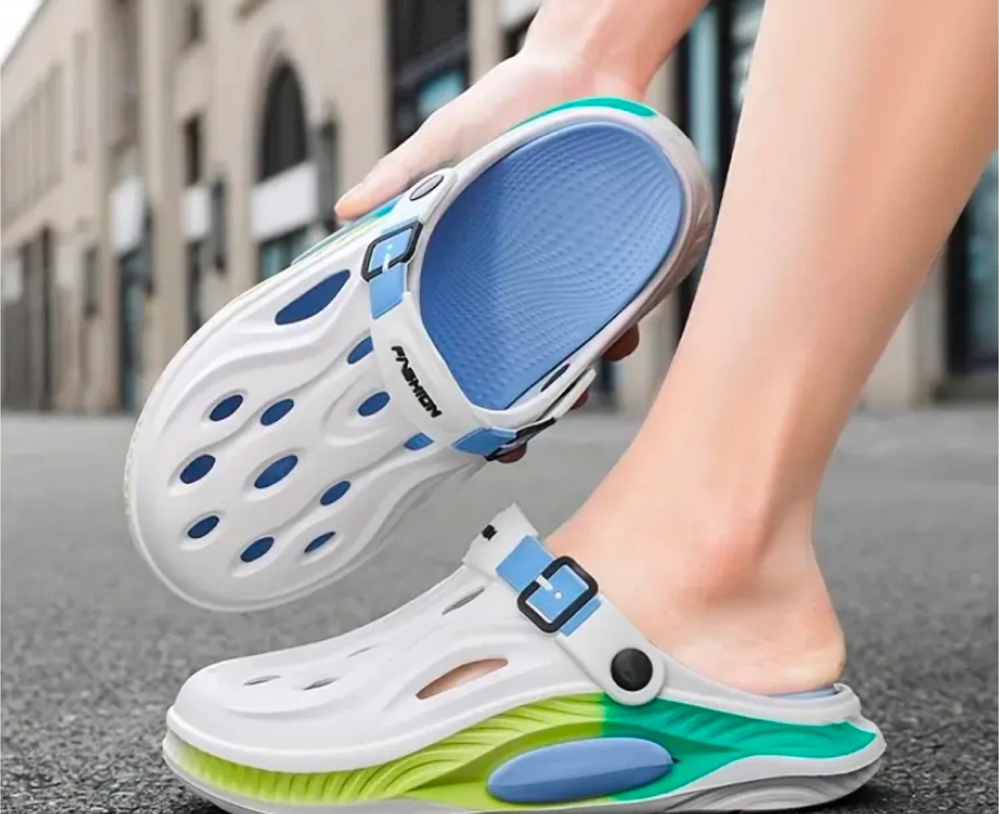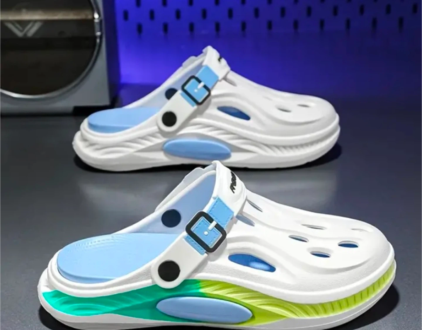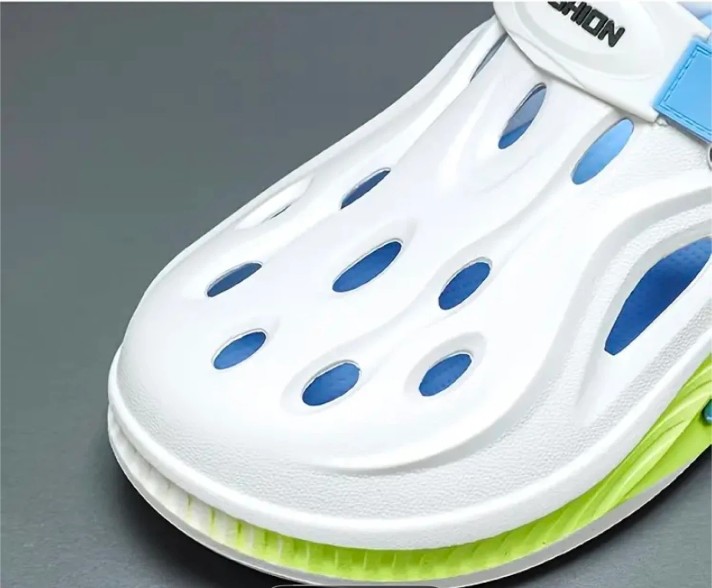 Selling a pair of fashionable clogs in white with blue accents! These are lightweight and comfy, perfect for casual wear. The clogs feature a unique design with vent holes and an adjustable buckle strap. Great for summer!
