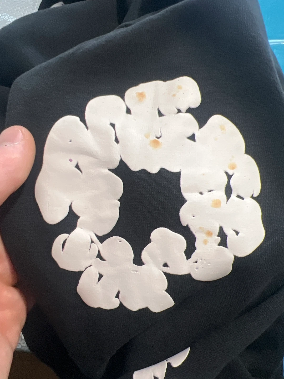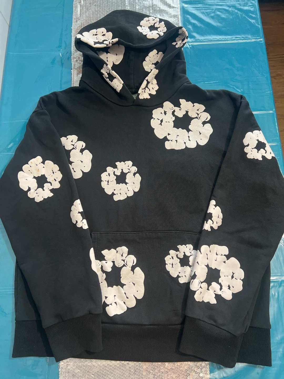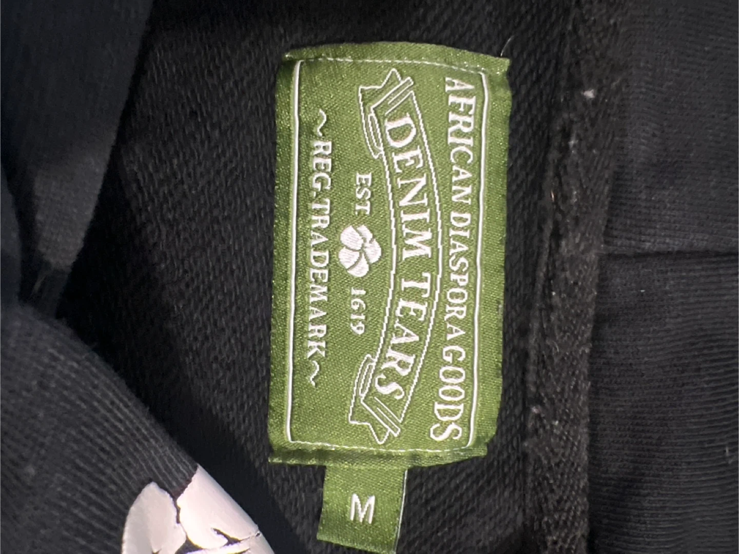 Selling a Denim Tears hoodie in black. It features a unique floral design and is a size M. The tag indicates it was made in the USA. It's in great shape! Only a stain on one of the flowers on the sleeve.