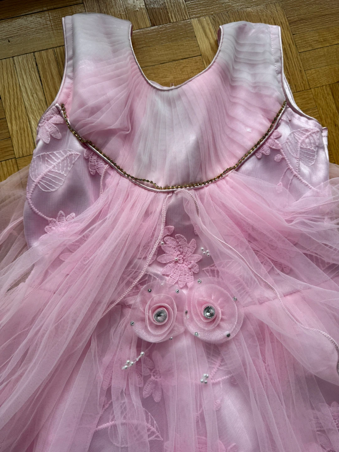 A beautiful pink dress, perfect for a flower girl or special occasion! It features delicate flower details and a layered tulle skirt. It's in great condition and ready to make someone's day extra special.