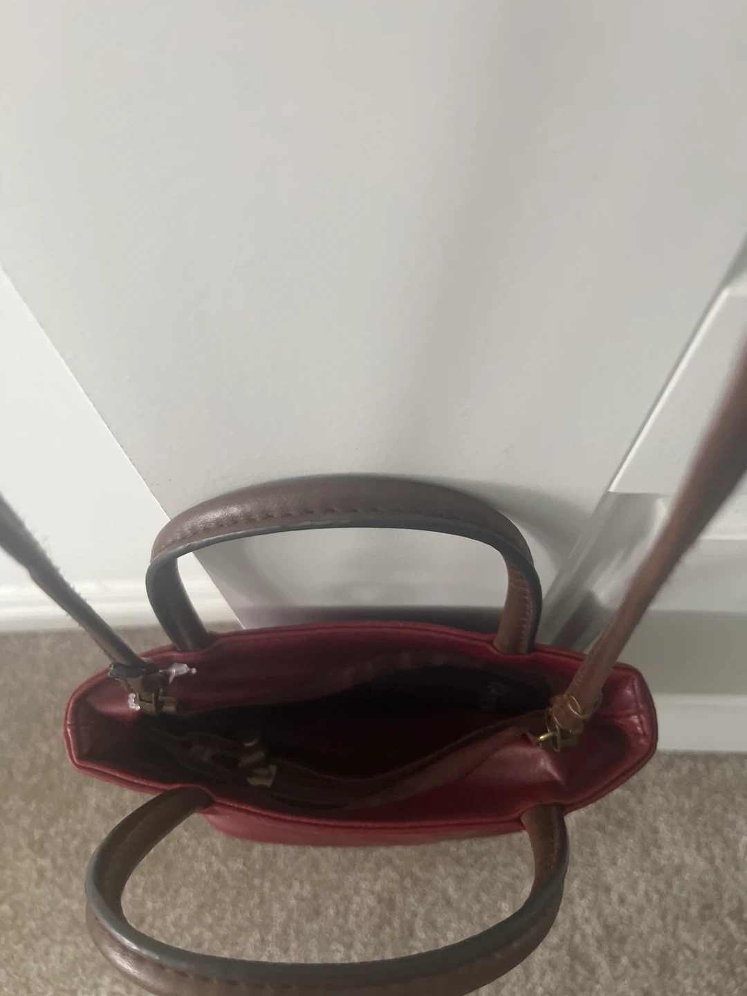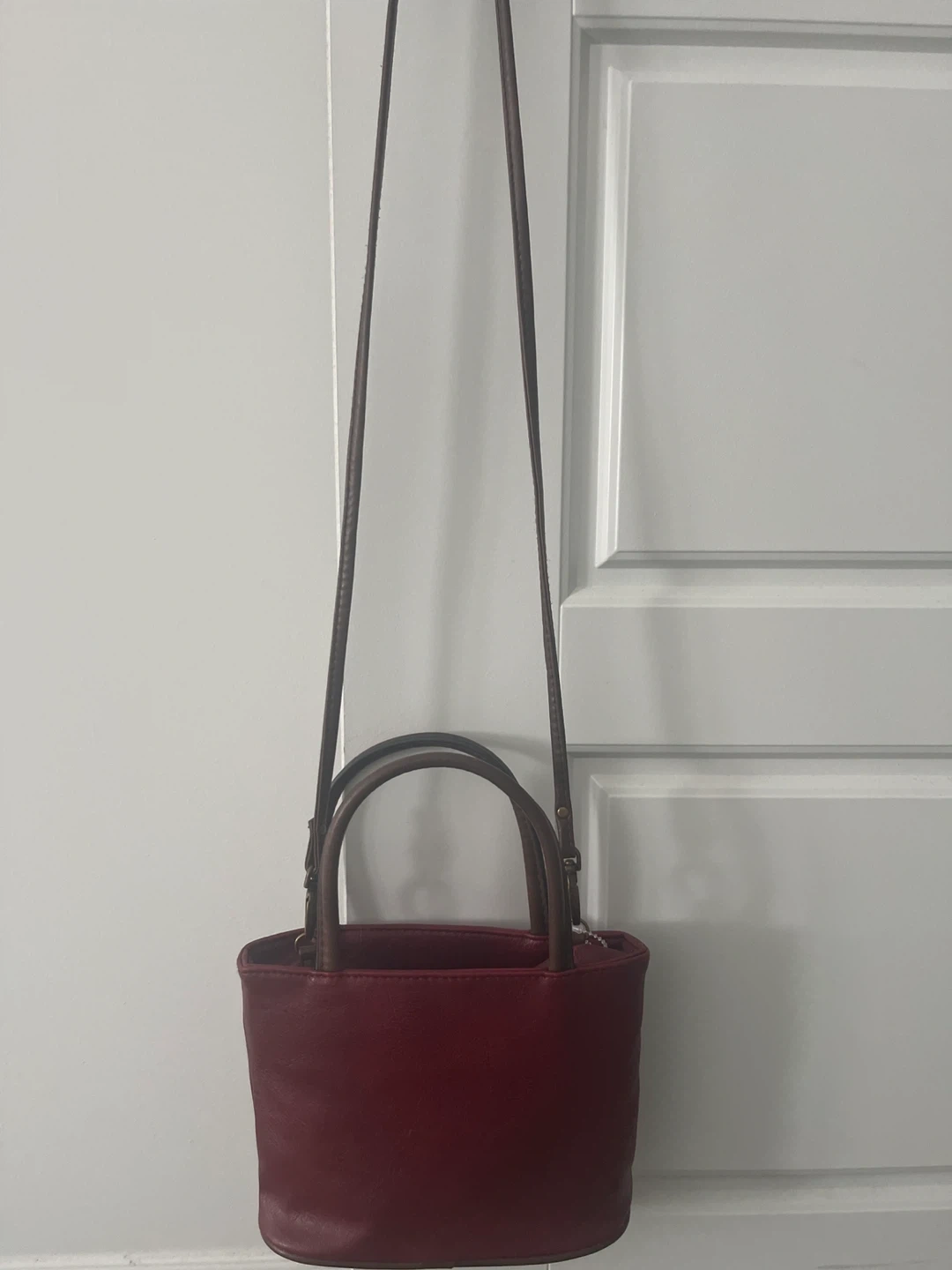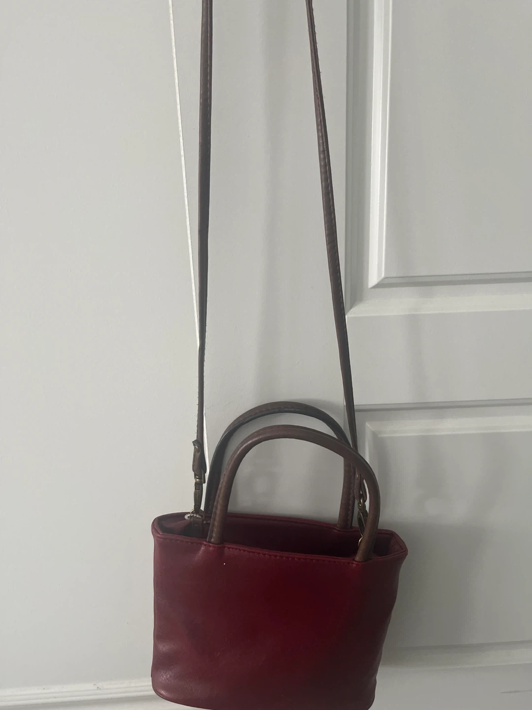 A cute burgundy leather handbag with brown handles! It's in great condition and ready for a new owner. Perfect for carrying your essentials in style! Pet and smoke free home π