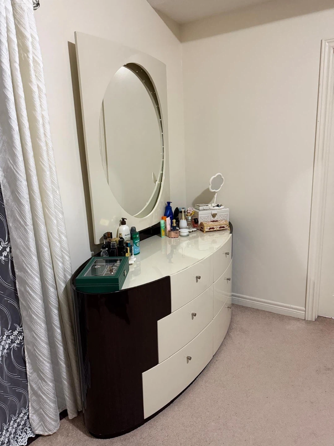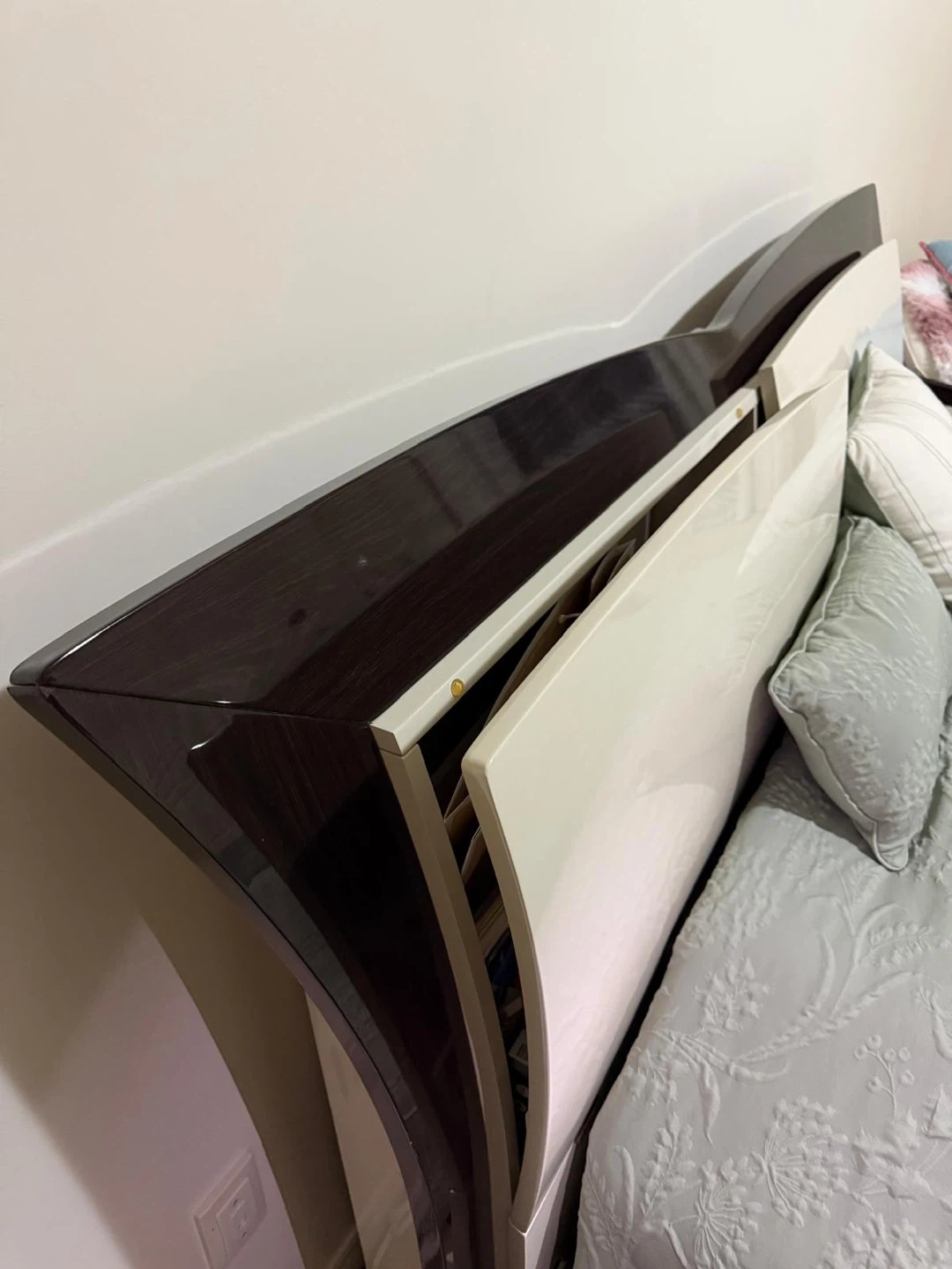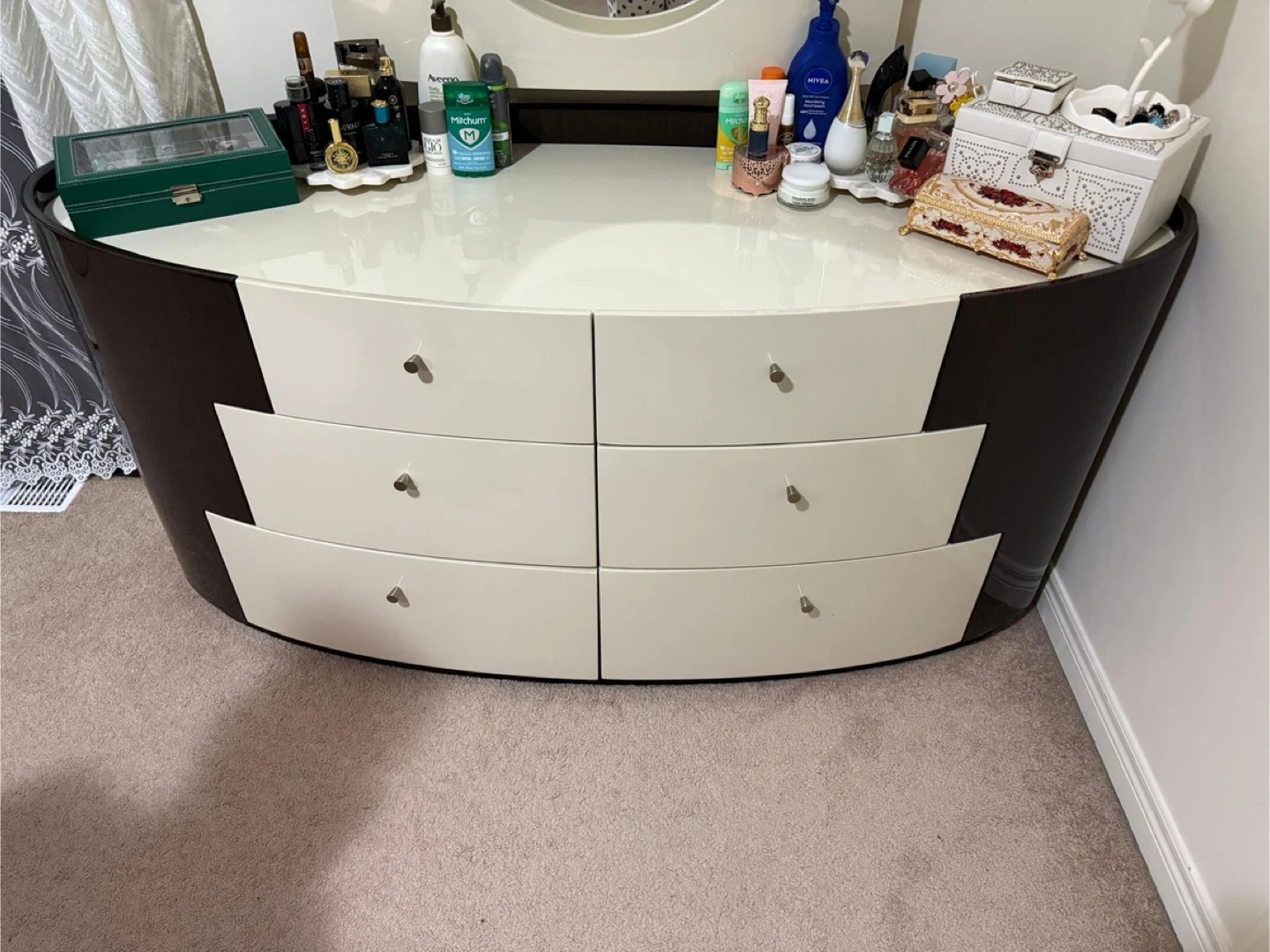 Selling a queen bedroom set of 5 pieces that includes a bed frame and a matching nightstand and dresser mirror. The bed frame features a unique headboard design with storage and the nightstand has two drawers for storage, and dresser mirror with 6 deep drawers. Great set for a bedroom!