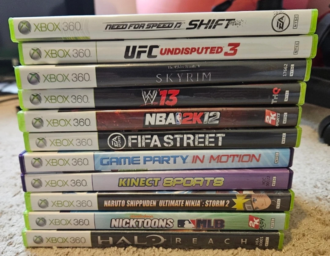 Selling an Xbox 360 console! It comes with the Kinect sensor and a selection of games, including Need for Speed Shift, UFC Undisputed 3, Skyrim, WWE 13, NBA 2K12, FIFA Street, Game Party in Motion, Kinect Sports, Naruto Shippuden Ultimate Ninja Storm 2, Nicktoons MLB, and Halo Reach