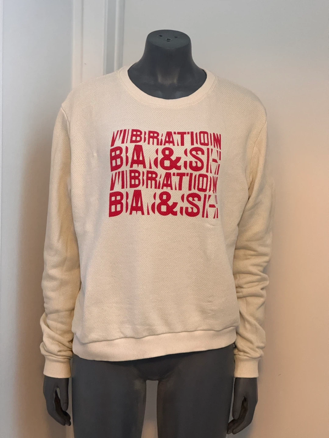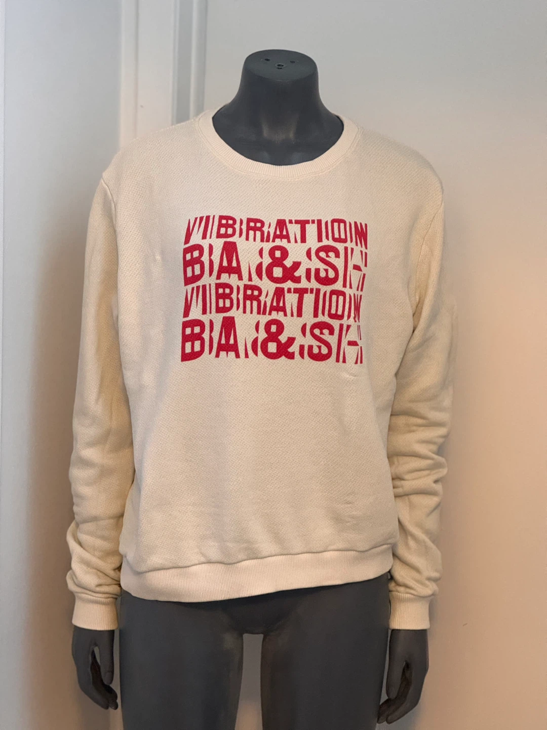 Selling a ba&sh Vibration sweatshirt in size 3. The sweatshirt is a cream colour with a red graphic print. A stylish and comfortable addition to your wardrobe!