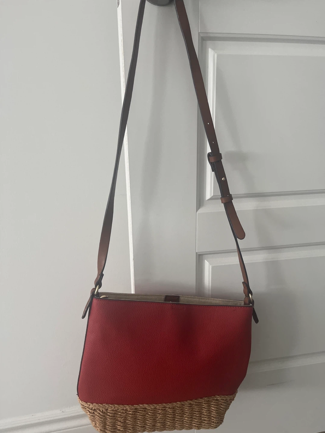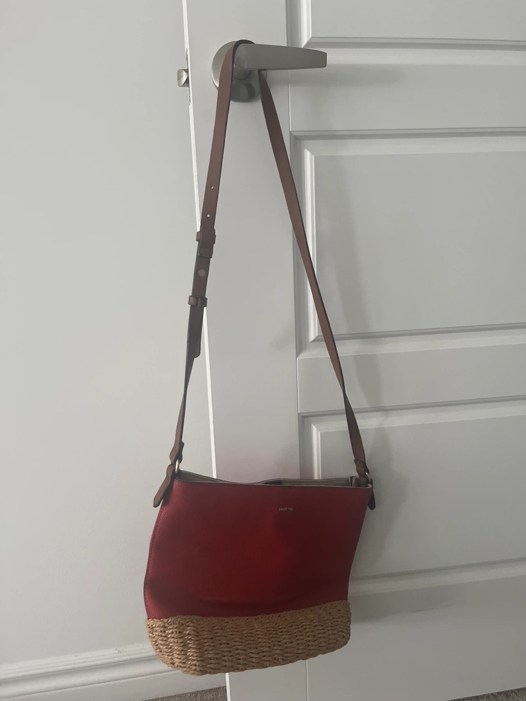 Here's a cute red crossbody bag from Parfois! It's in great condition and ready for a new owner. The bag features a unique design with a woven bottom and a red textured top. Perfect for adding a pop of colour to any outfit! Pet and smoke free home π