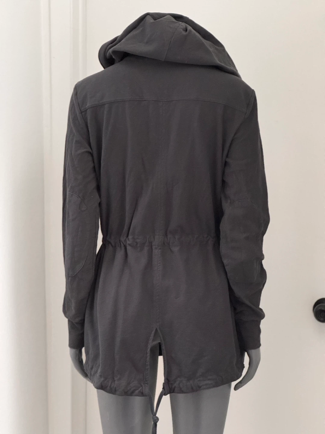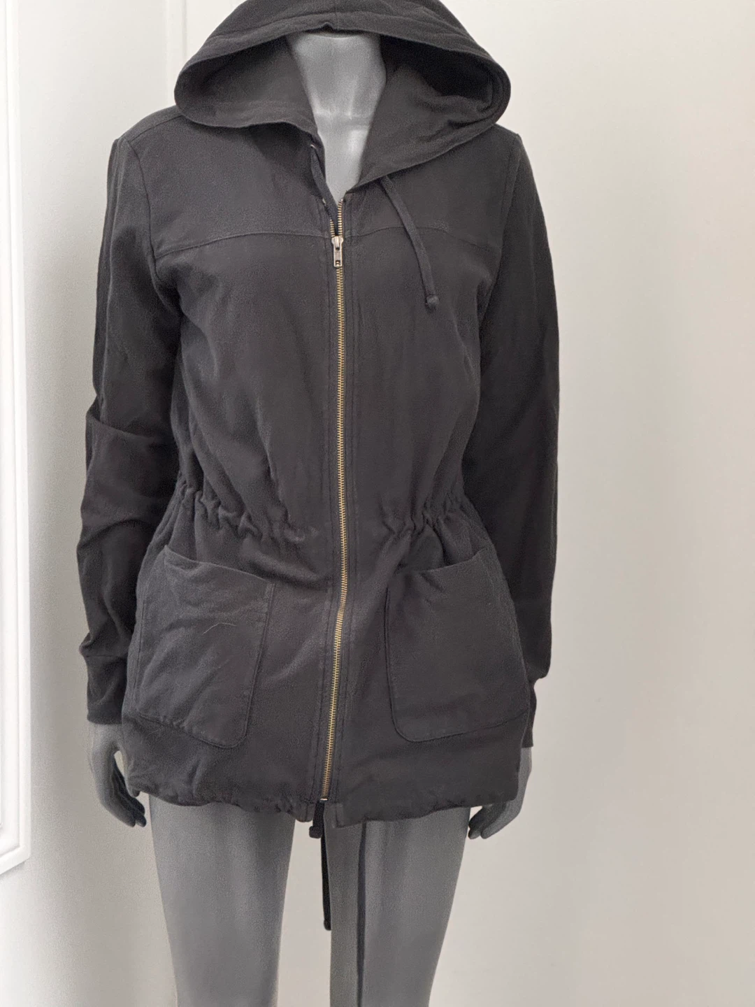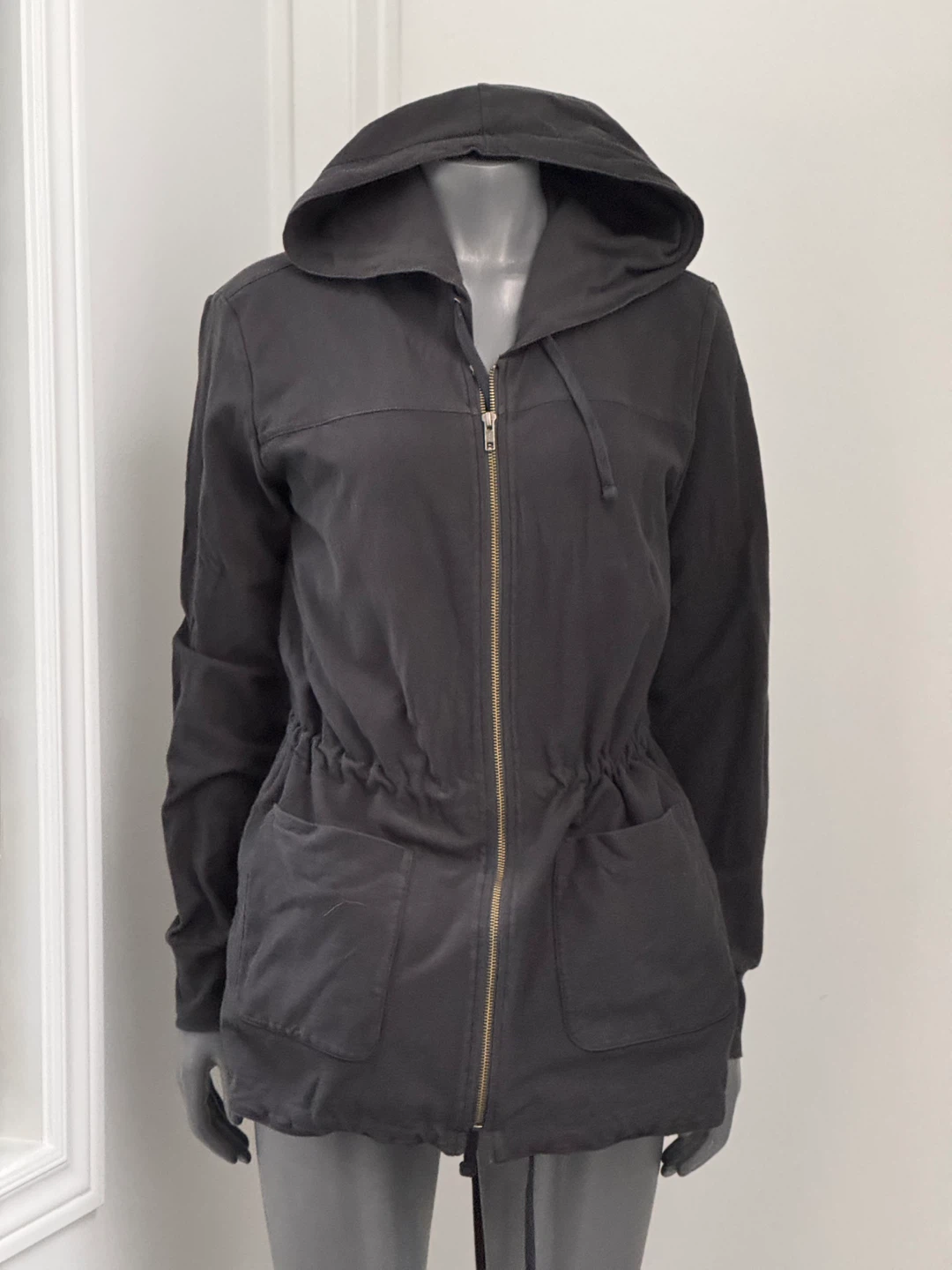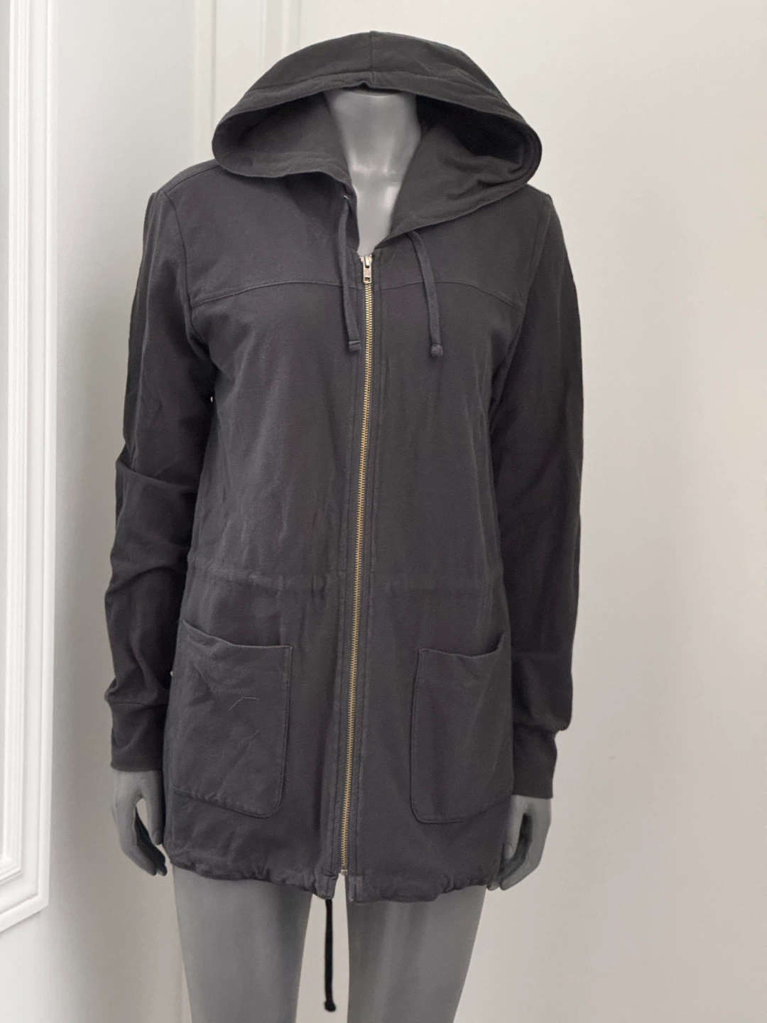 Here's a James Perse Standard hooded jacket in a dark grey colour! It features a zipper closure and a drawstring at the waist. The size is 3.