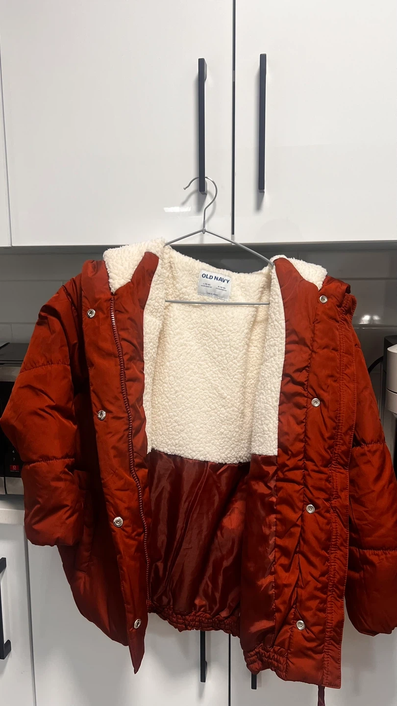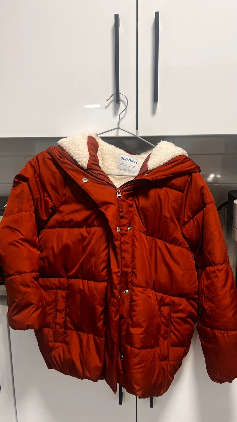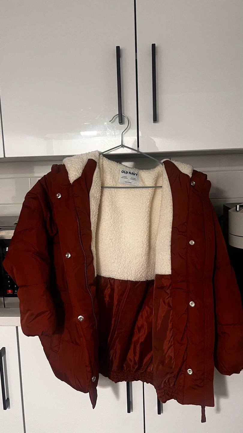 Cozy Old Navy puffer jacket, perfect for keeping warm! It's a size L (10-12) and features a sherpa-lined hood. The colour is a lovely reddish-brown. It's water-resistant too!