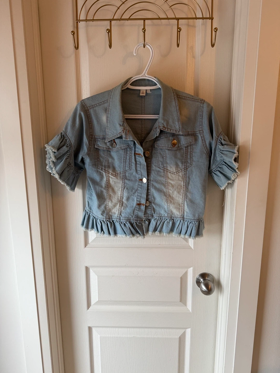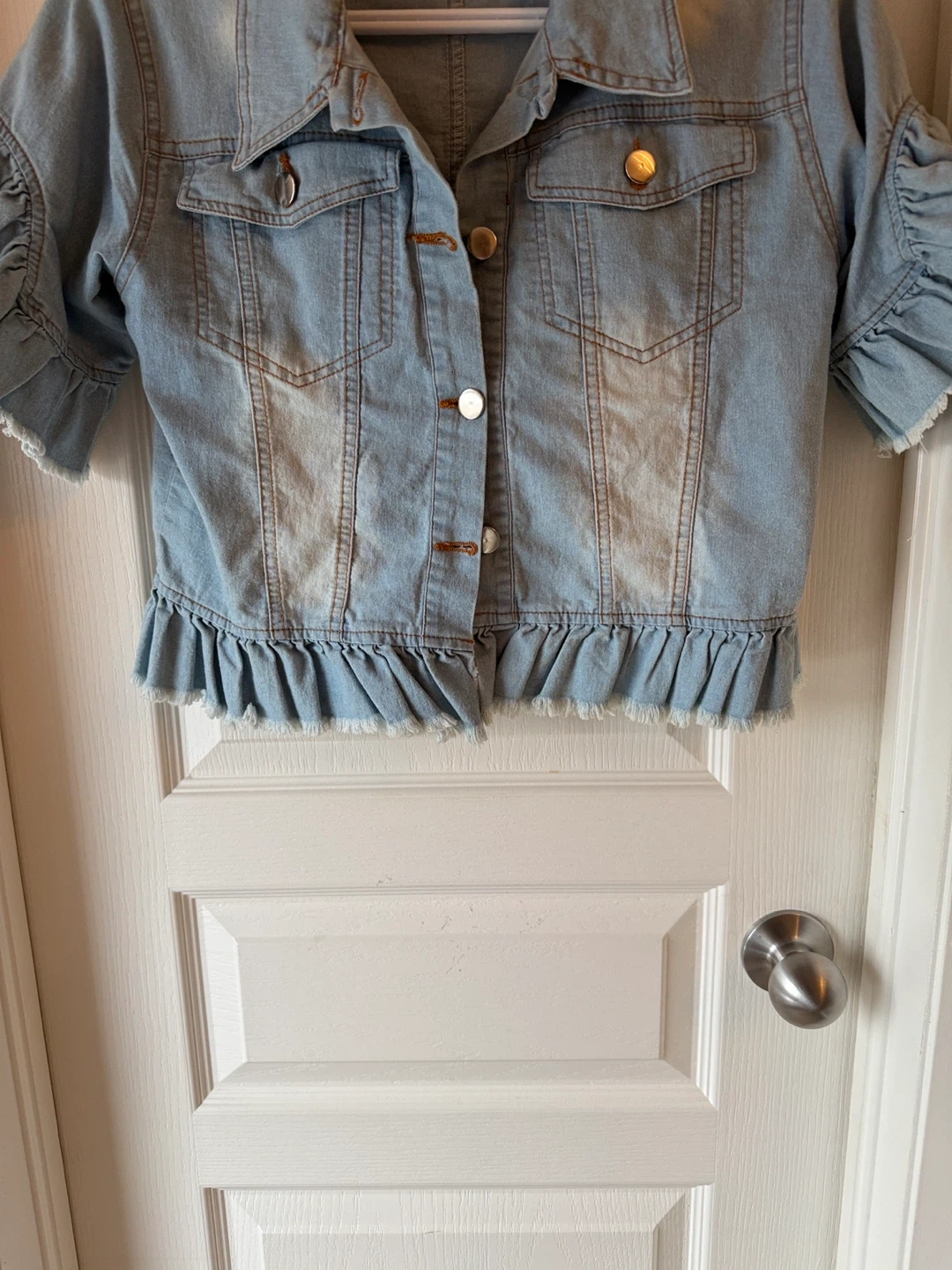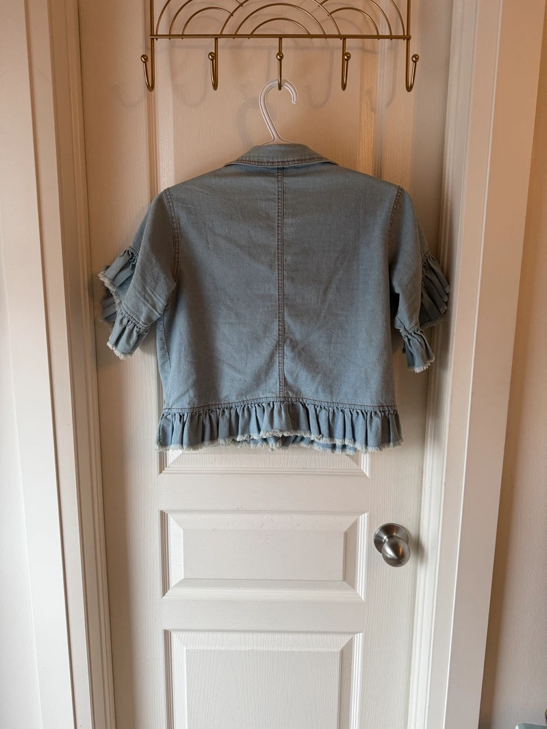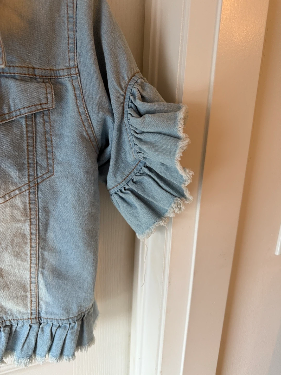 Soft denim jacket. It's a light wash denim with ruffle detailing on the sleeves and bottom.
