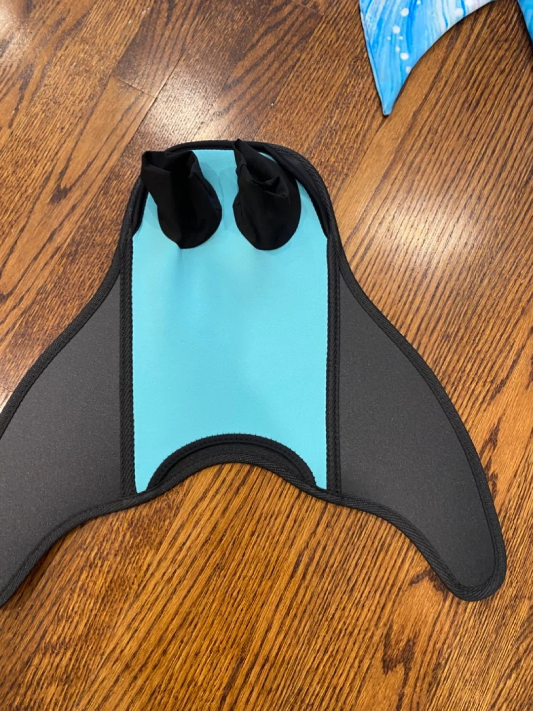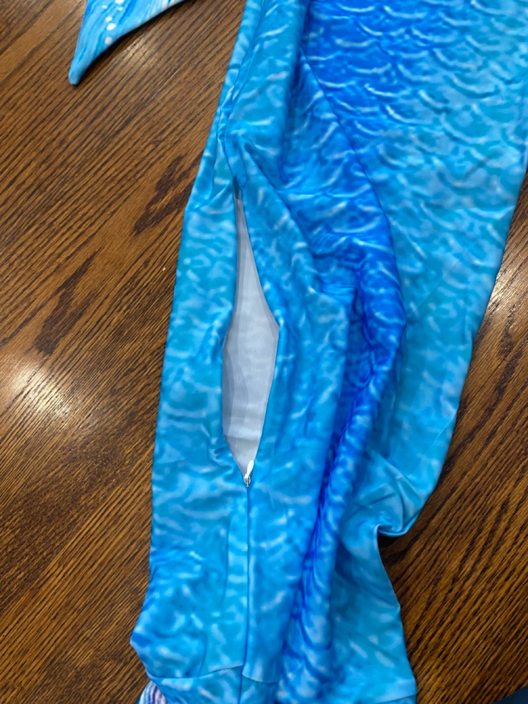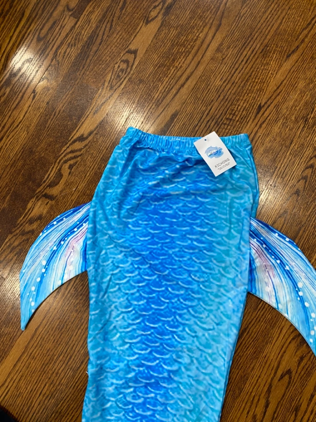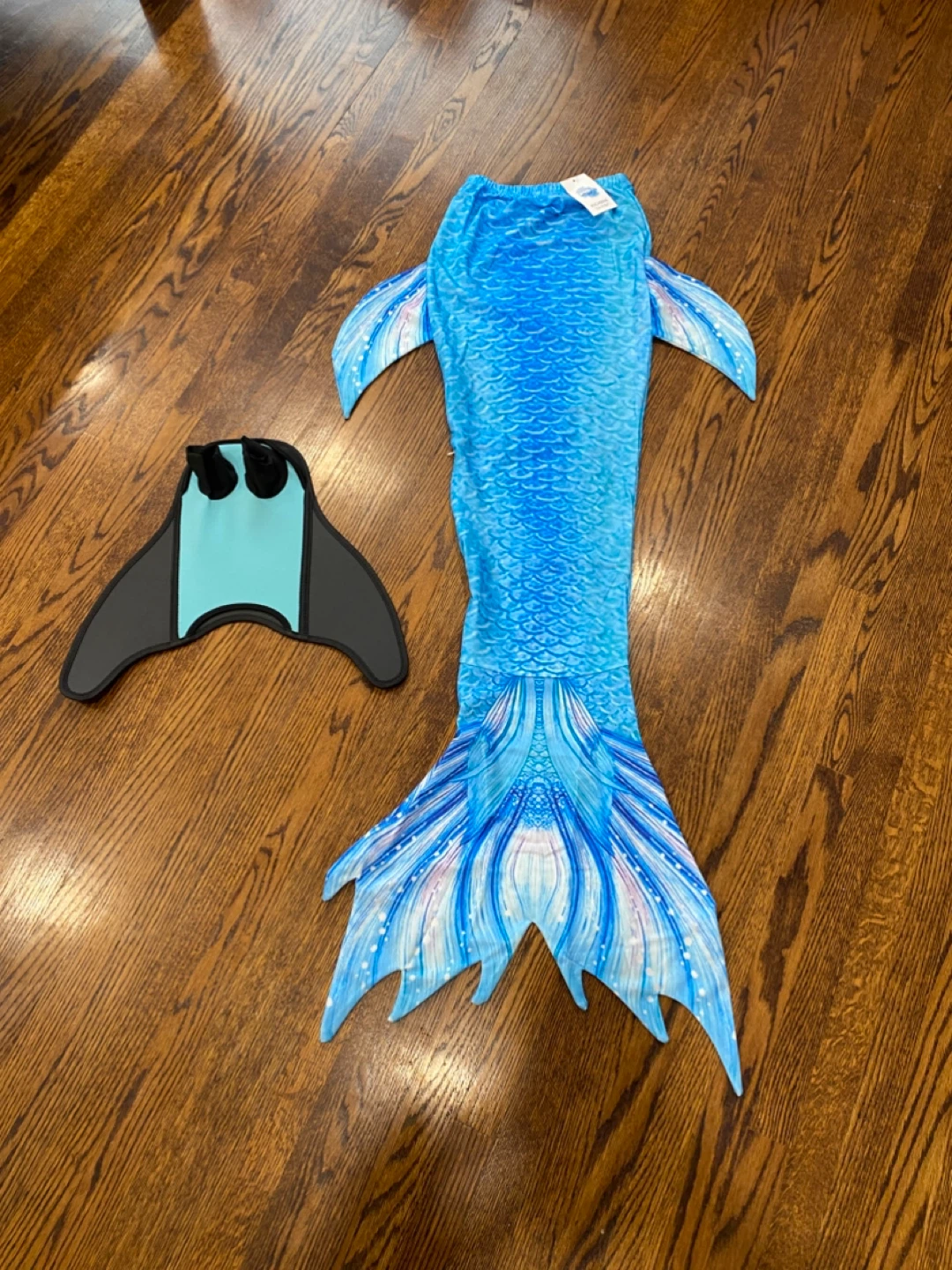 Selling a NEW with tags still attached mermaid tail in a beautiful blue colour! It comes with a monofin to help you glide through the water. Perfect for dress-up or pool parties! There is a side zipper to help insert the fin. The site indicates it’s good for ages 3-12. But I think it’s idea ages 7-10 years old.
