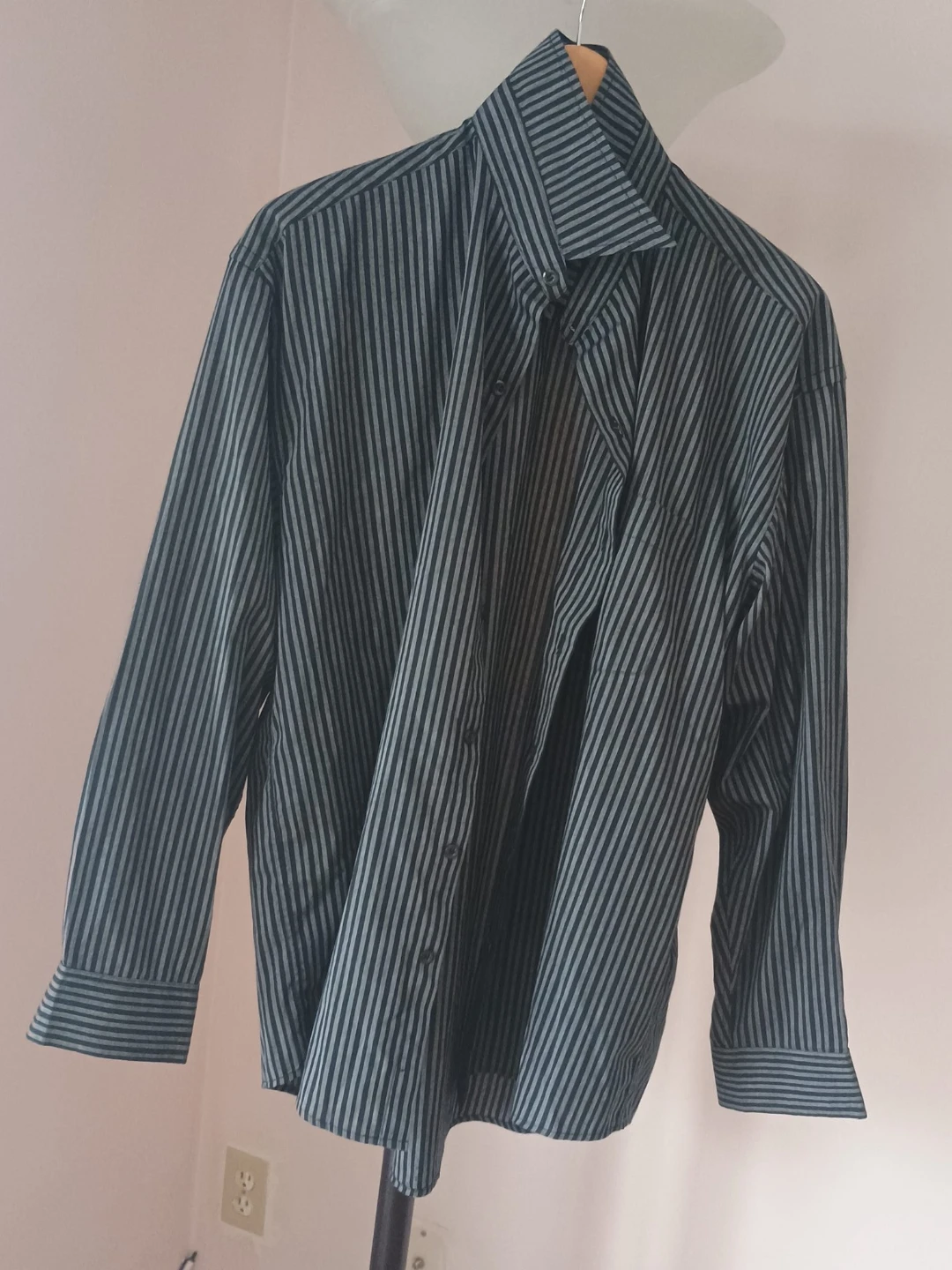 Here's a striped long sleeve shirt! It's in good condition and ready for a new owner. It features a classic striped pattern in shades of grey and black.