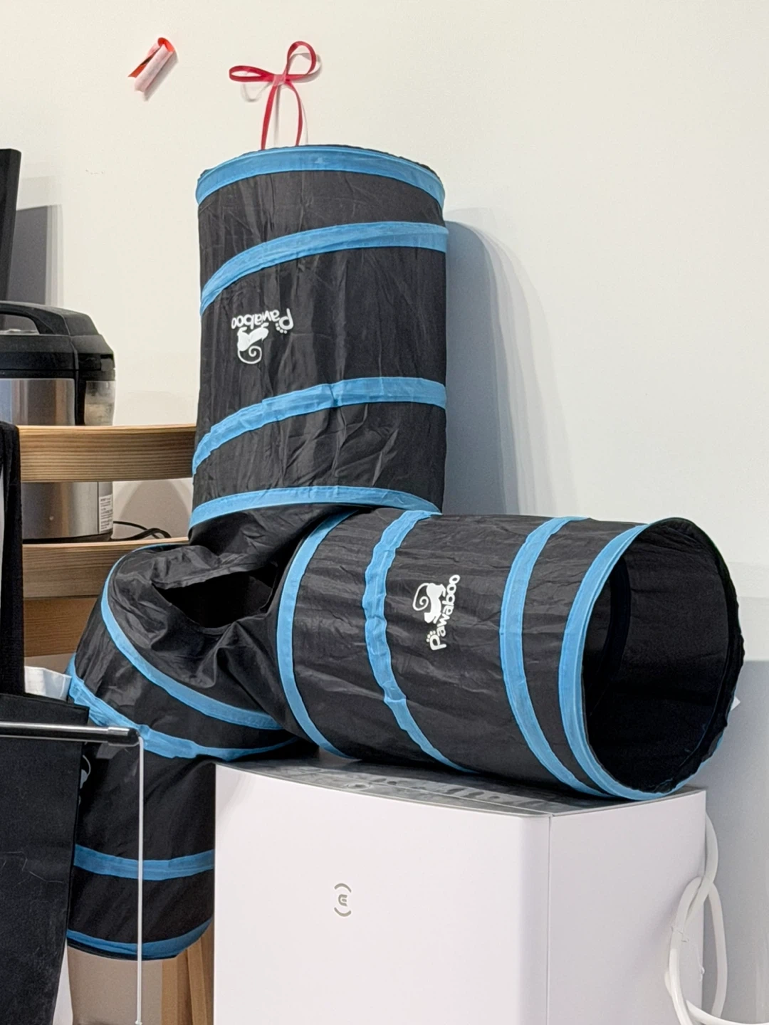 Check out this Pawaboo collapsible cat tunnel! It's in great shape and ready for a new feline friend to explore. The black material with blue trim will look great in any home. Your cat will love playing and hiding in this fun tunnel!