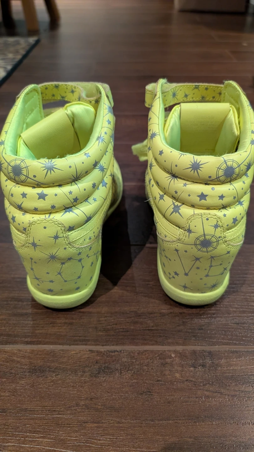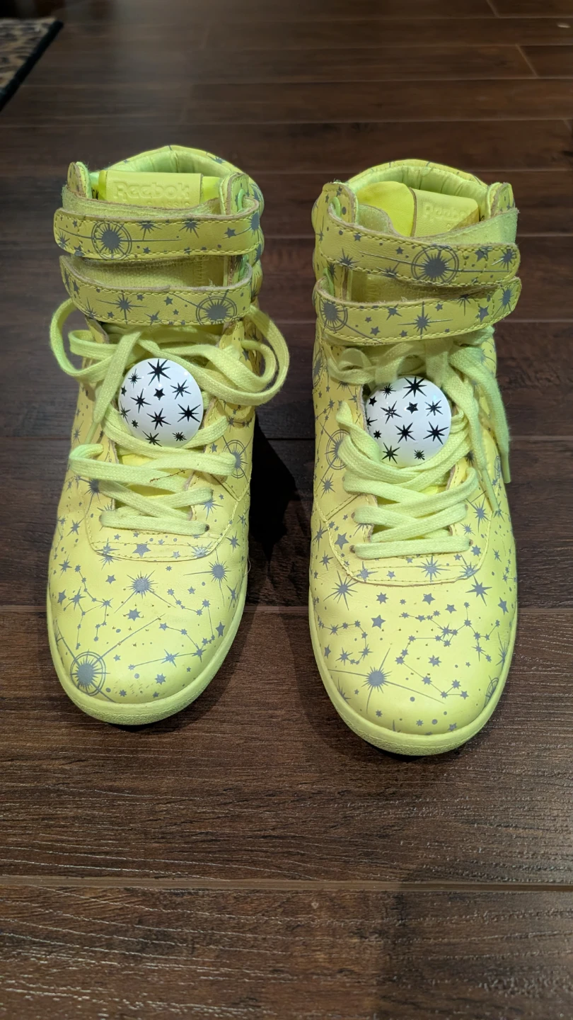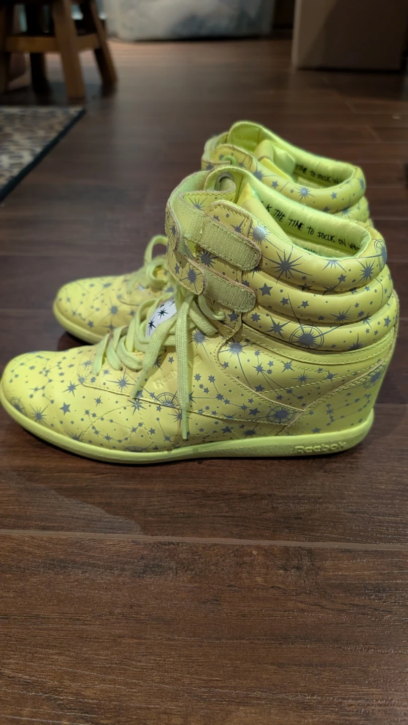 Selling a pair of Reebok Classic Freestyle Hi Wedge shoes in collaboration with Melody Ehsani. They feature a unique yellow colourway with star and constellation designs. Pick up in Markham, just off of the 404
