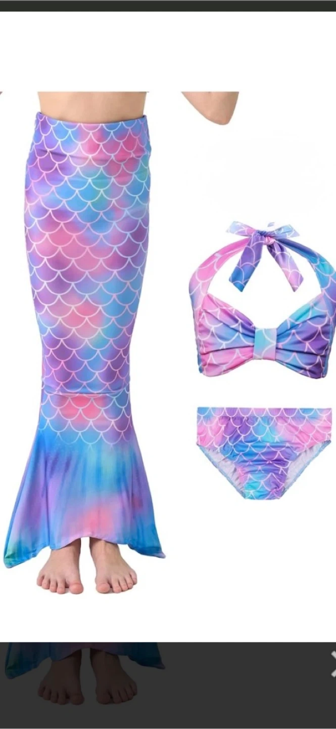 Selling a cute mermaid tail swimsuit set from Fin Fun! It includes the mermaid tail, bikini top, bikini bottom, and monofin. Perfect for some fun in the water. Ideal fit for ages 7-10 yrs old.