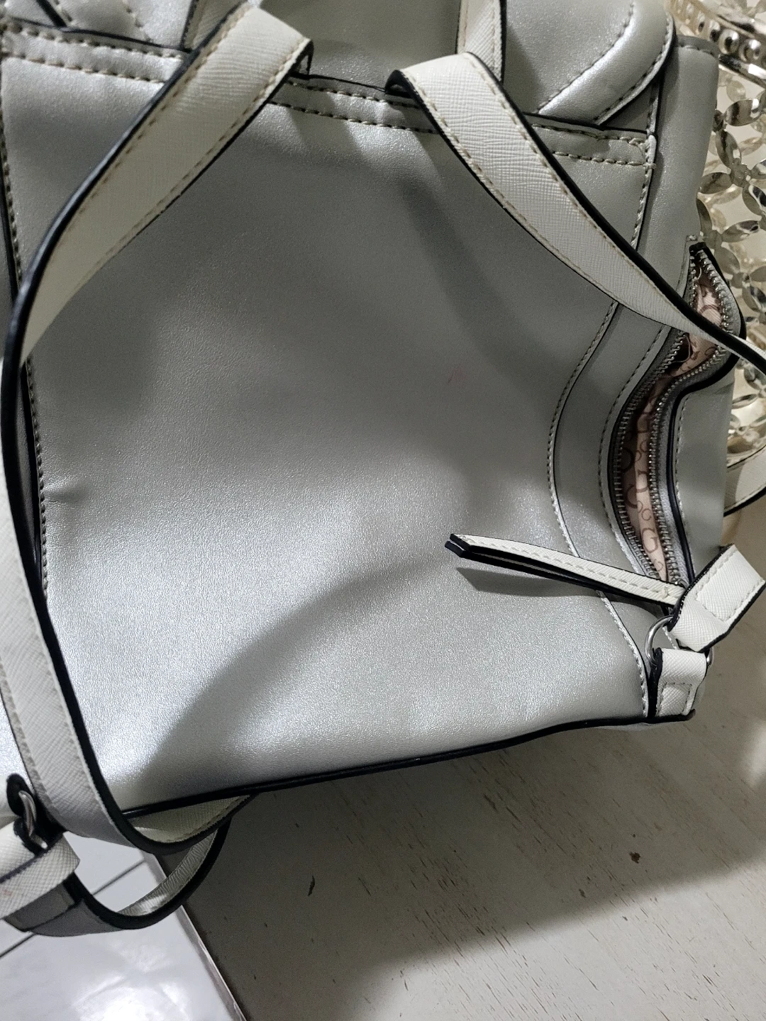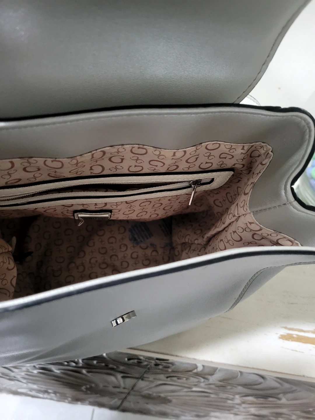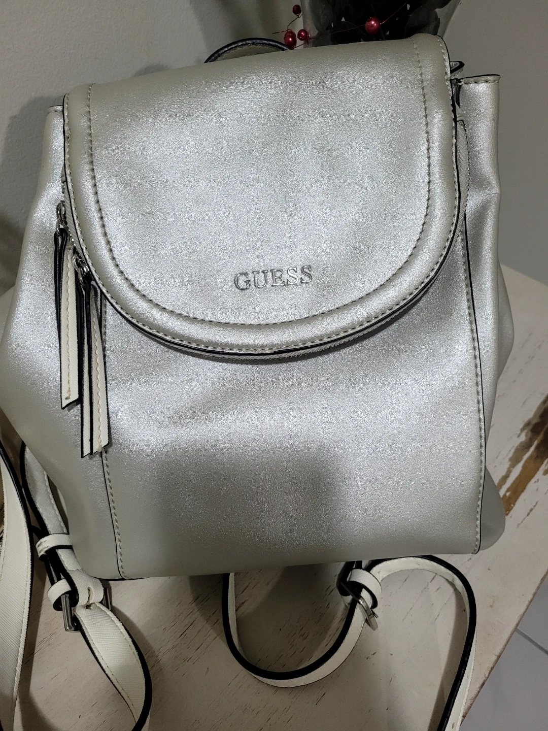 Cute silver Guess backpack in great condition! It's a stylish and functional bag perfect for everyday use. The interior lining has the Guess logo.