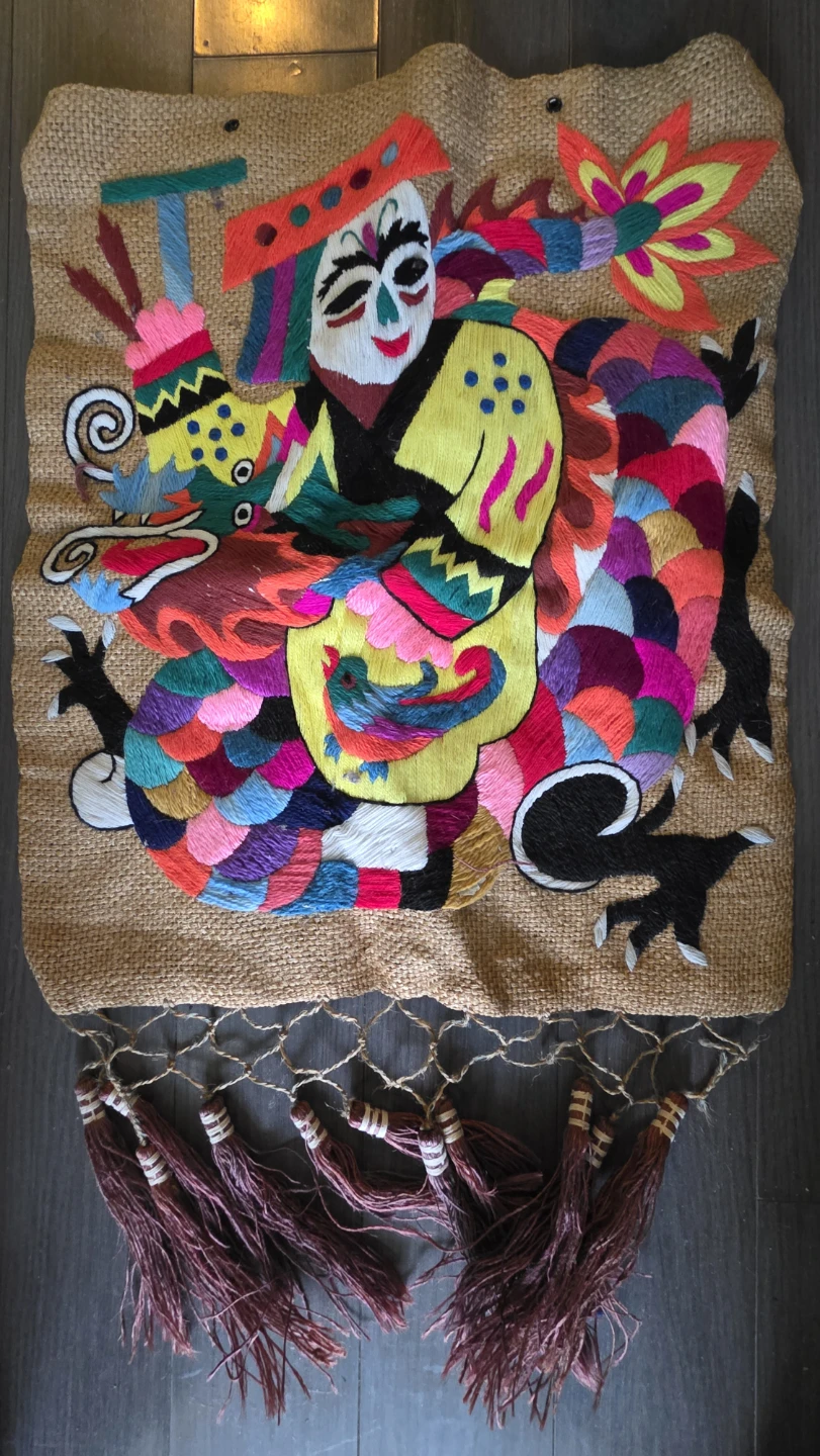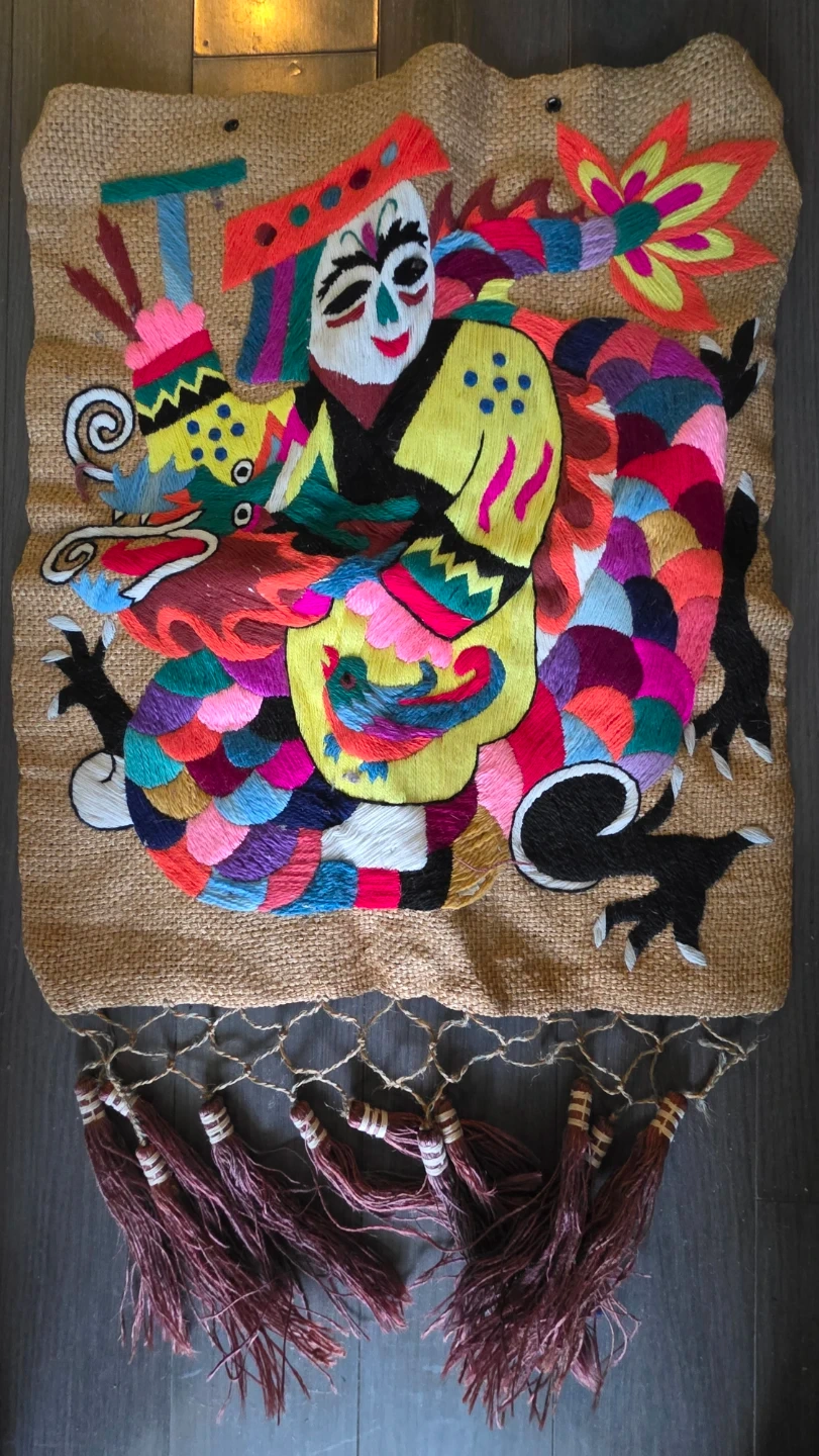 This is a beautiful, colourful embroidered wall hanging featuring a dragon and figure. It's a unique piece that would add a pop of colour to any room!