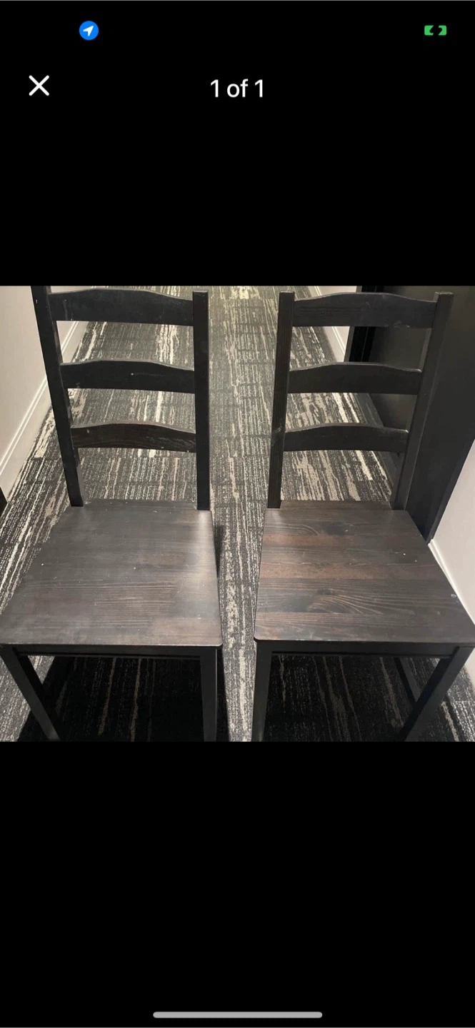 Selling a set of two chairs! They have a dark wood finish and are perfect for a dining room or kitchen. They show some signs of use, but are still sturdy and functional.